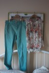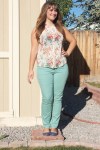 -I wore this lovely get up for a night of hamburgers and milkshakes out with my family. I love my mint jeans so much! I paired it with a floral patterned button up that has lace detail at the shoulders, I love it. I wore my denim blue flats with it to make the blue flowers in the shirt really pop. This shirt can go with so many different colored pants which is one of the best things about fashion!