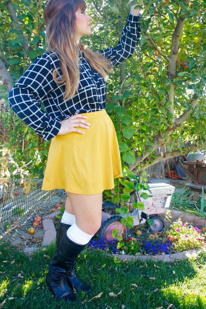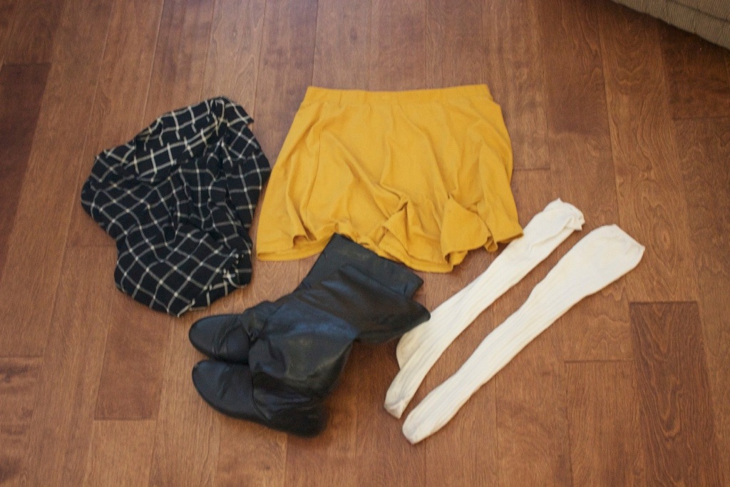 B&W Plaid Shirt; Forever 21 $19 White Knee High Socks; Forever 21 $4 Black Leather Boots; Burlington Coat Factory $20 Yellow Skirt; Charlotte Russe $10