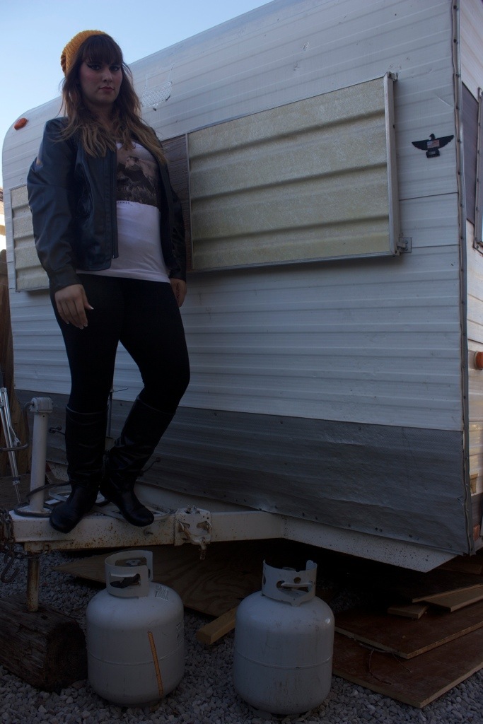 Black Leather Motorcycle Jacket; Ross $29 Leggings; Target $8 Horse Band Tee; Josiah James Original $15 Leather Boots; Burlington Coat Factory $20 Yellow Beanie; H&M $5