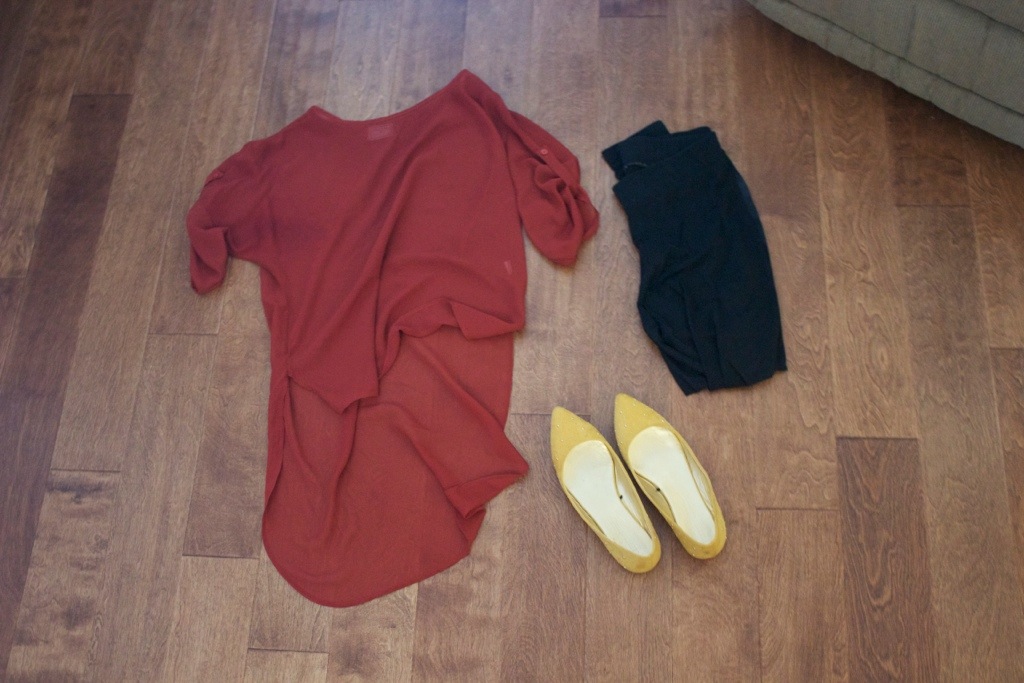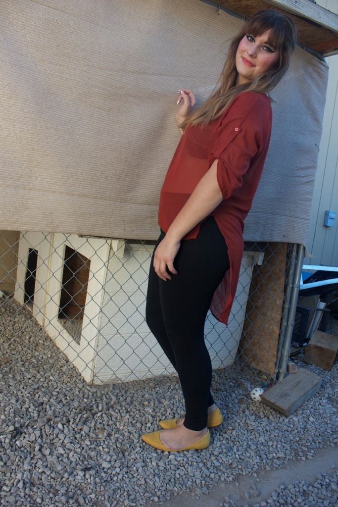 Scarlet Penguin Tail Blouse; Joppa $11 Leggings; Target $8 Yellow Flats; Forever 21 $24