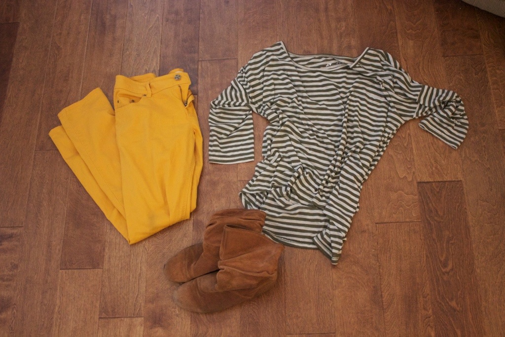 Striped Shirt; Burlington Coat Factory; $8 Brown Booties; JC Penny’s $20