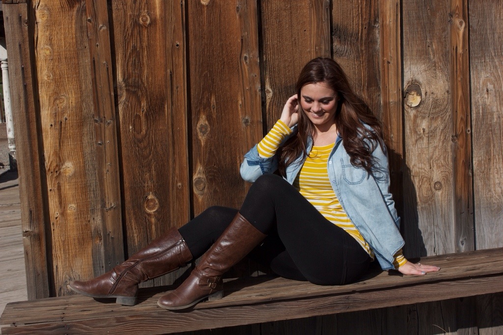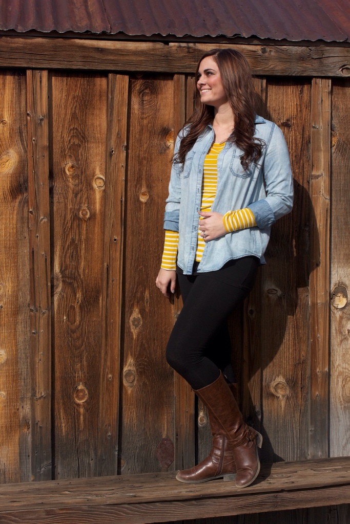 Love this look and the way that the faded denim looks with the striped yellow shirt. Such an easy look to make, same leggings and brown riding boots, long sleeved tee, and a denim button up. So cute! The rolled up sleeves give the outfit an extra pop of yellow which works. She’s a model, ain’t she?