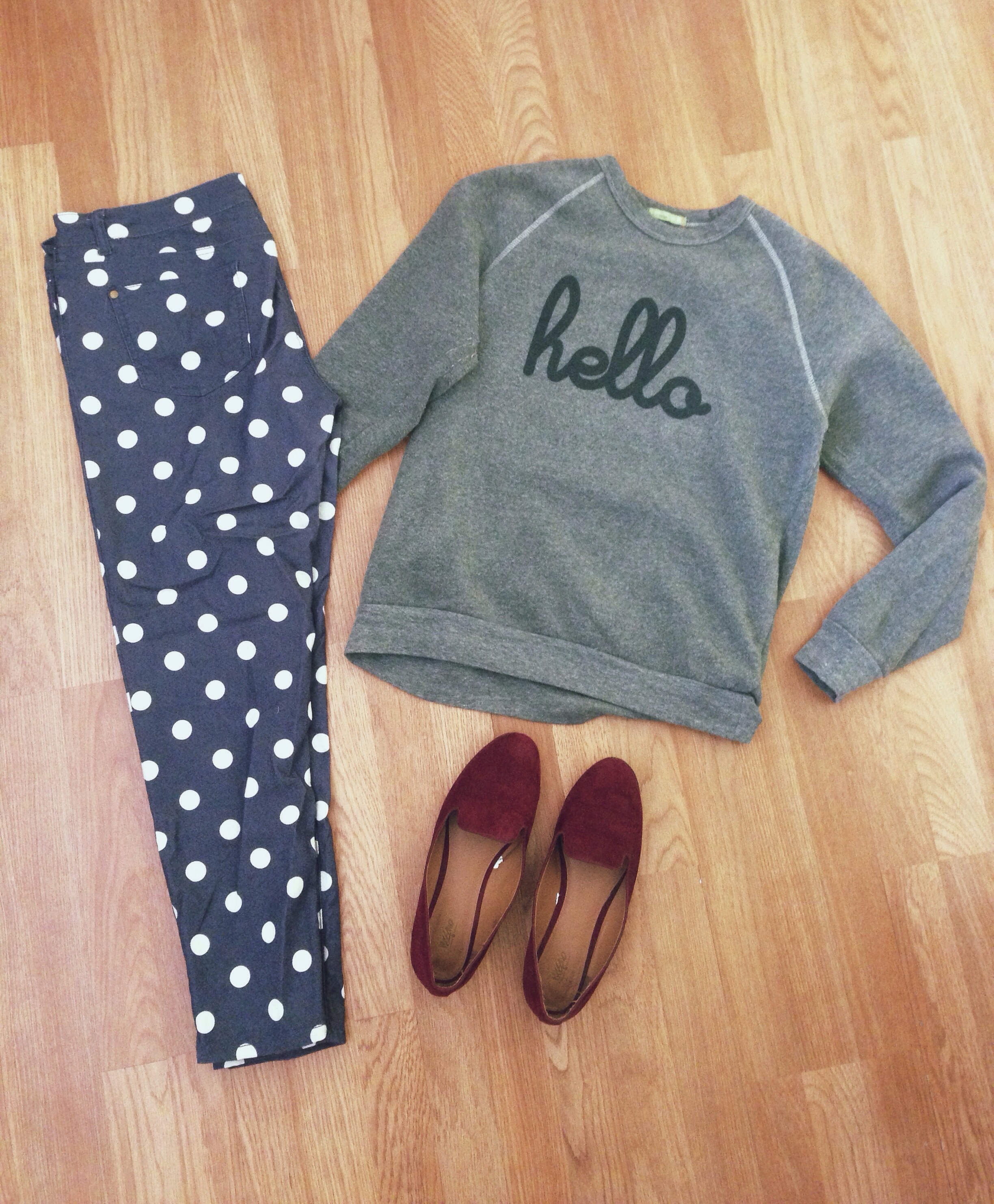 This is one of my favorite crew neck sweatshirts from the amazing Hello Apparel. They are a t-shirt printing company based out of Arizona & they make the cutest tees for babies, kids, & adults. You should definitely check them out and follow them on Instagram @helloapparel for awesome giveaways & deals. Love their brand & product so much! I basically own one of everything in their online store! Check em out! Seriously! Anyways, I paired their grey “hello” pullover with my Forever 21 polka dot jeans & some maroon loafers that I got at Target for 9 bucks. I love these colors & the look of just everything here.