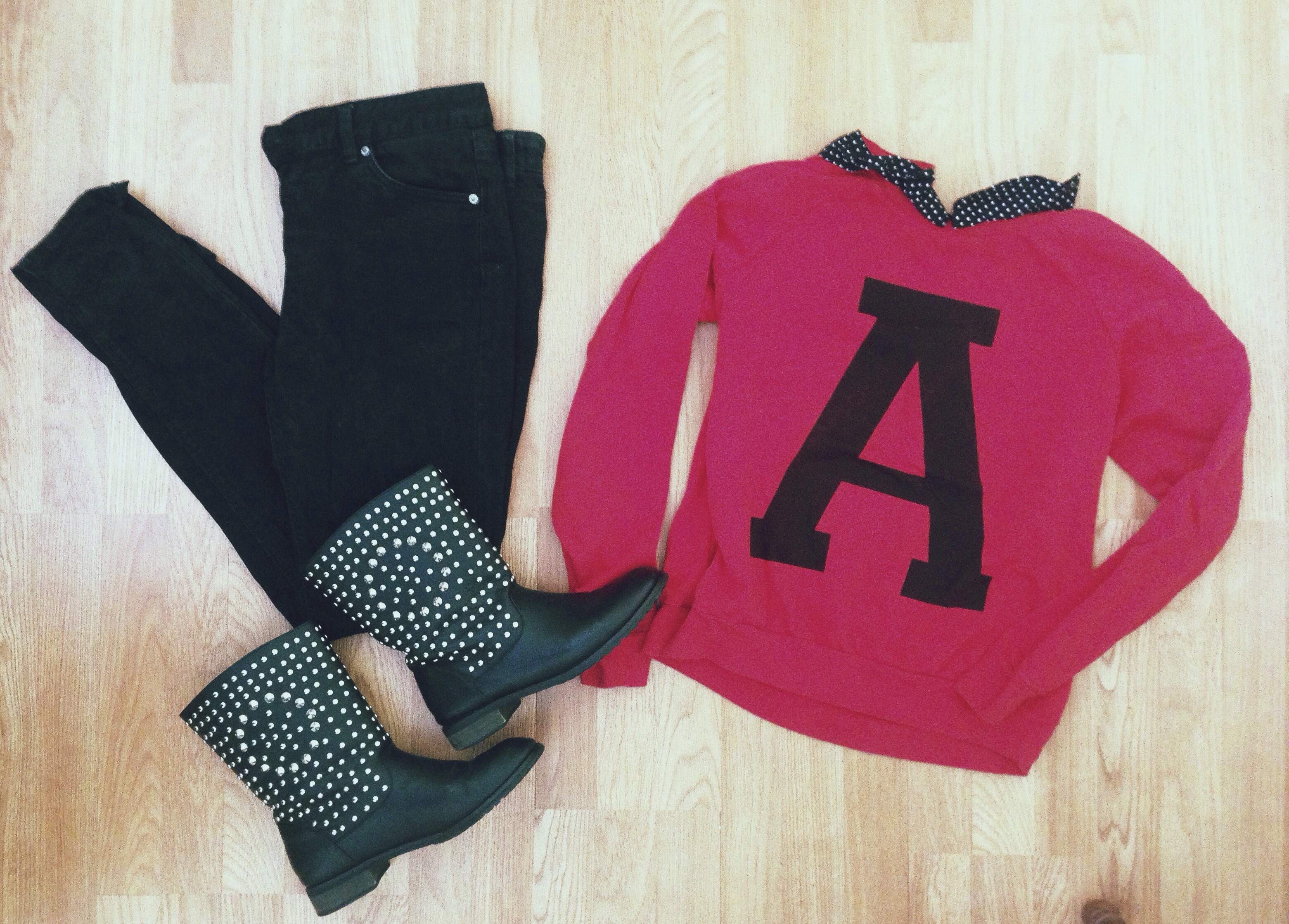This look I have actually worn before! This is my “A” crew neck that I picked up at Forever 21 last winter. I saw it & fell in love! I’m lucky that most clothes that have random letters on it have been a’s & that I get to rock them with confidence & no shame! Go A being for awesome Abbey! The detail on this sweatshirt was perfect as well, a polka dot Peter Pan collar is to die for! Always! It goes perfect with my black skinny jeans & leather studded biker boots. This outfit is always a statement maker in my book! Don’t be afraid to dress bold & out of your comfort zone sometimes.