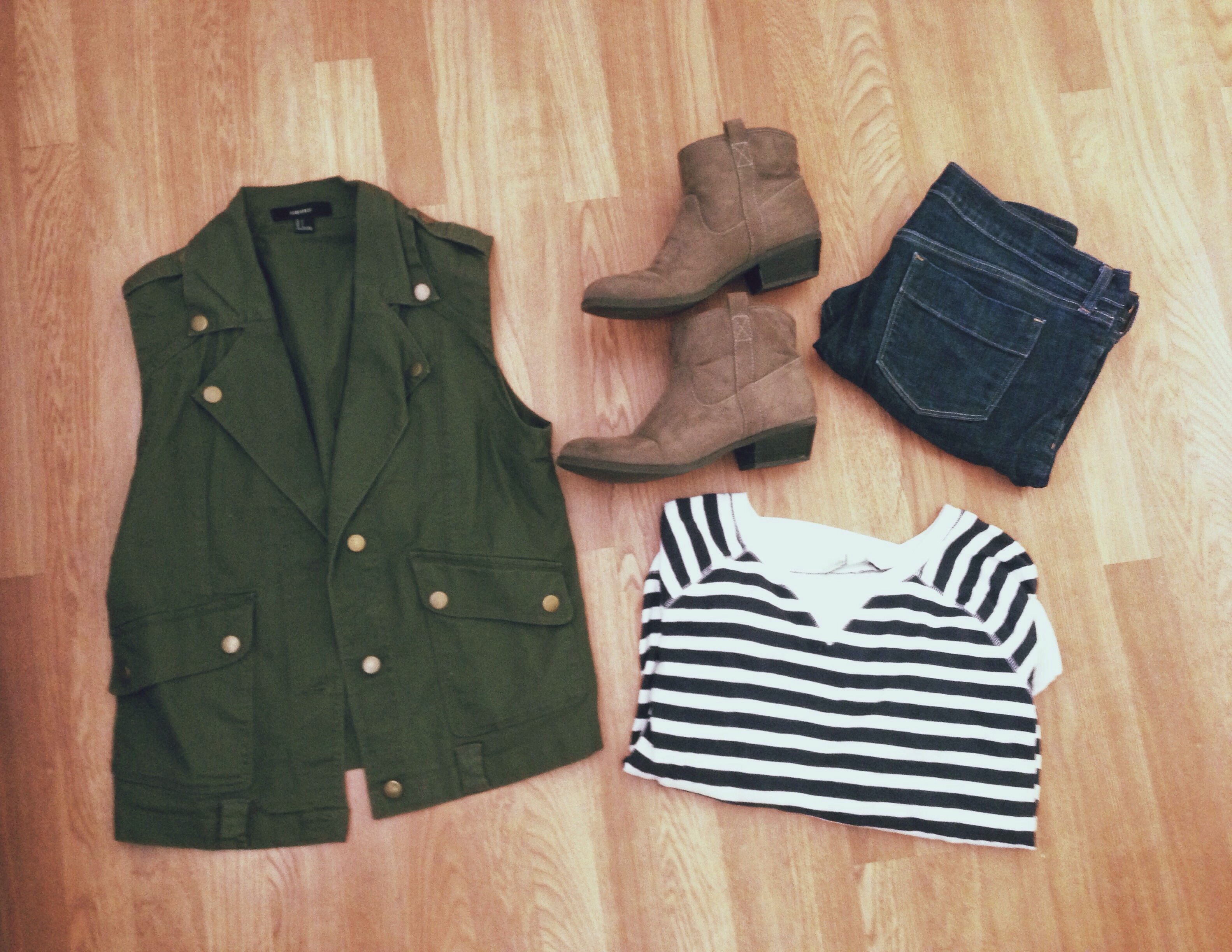 This one is a classic. You take a striped sweatshirt, pair it with some dark jeans, any type of vest & some little tan booties & it’s perfect. This outfit is so versatile & cute. Great for an afternoon of shopping or even a walk in the park.