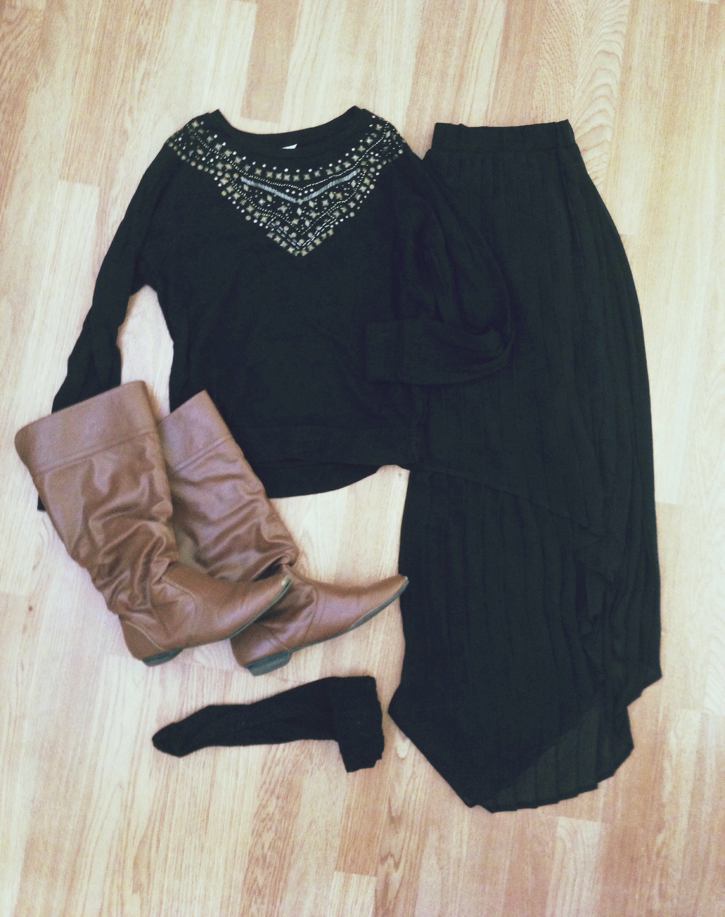 I wore this outfit last winter too! I loved it & will probably wear something similar to this again. When I saw this black sweatshirt with gold studs all over it last year at Forever 21 I fell in love!! I know what you’re thinking and yes, I fall in love with clothes quite a bit… Anyways it has perfect detail so what’s not to love! Wearing it with my black high to low skirt, some black knit tights, & my brown leather boots made the outfit a hit! I love the (almost) monochromatic look of this outfit & it makes wearing a sweatshirt look like I actually tried in the morning!