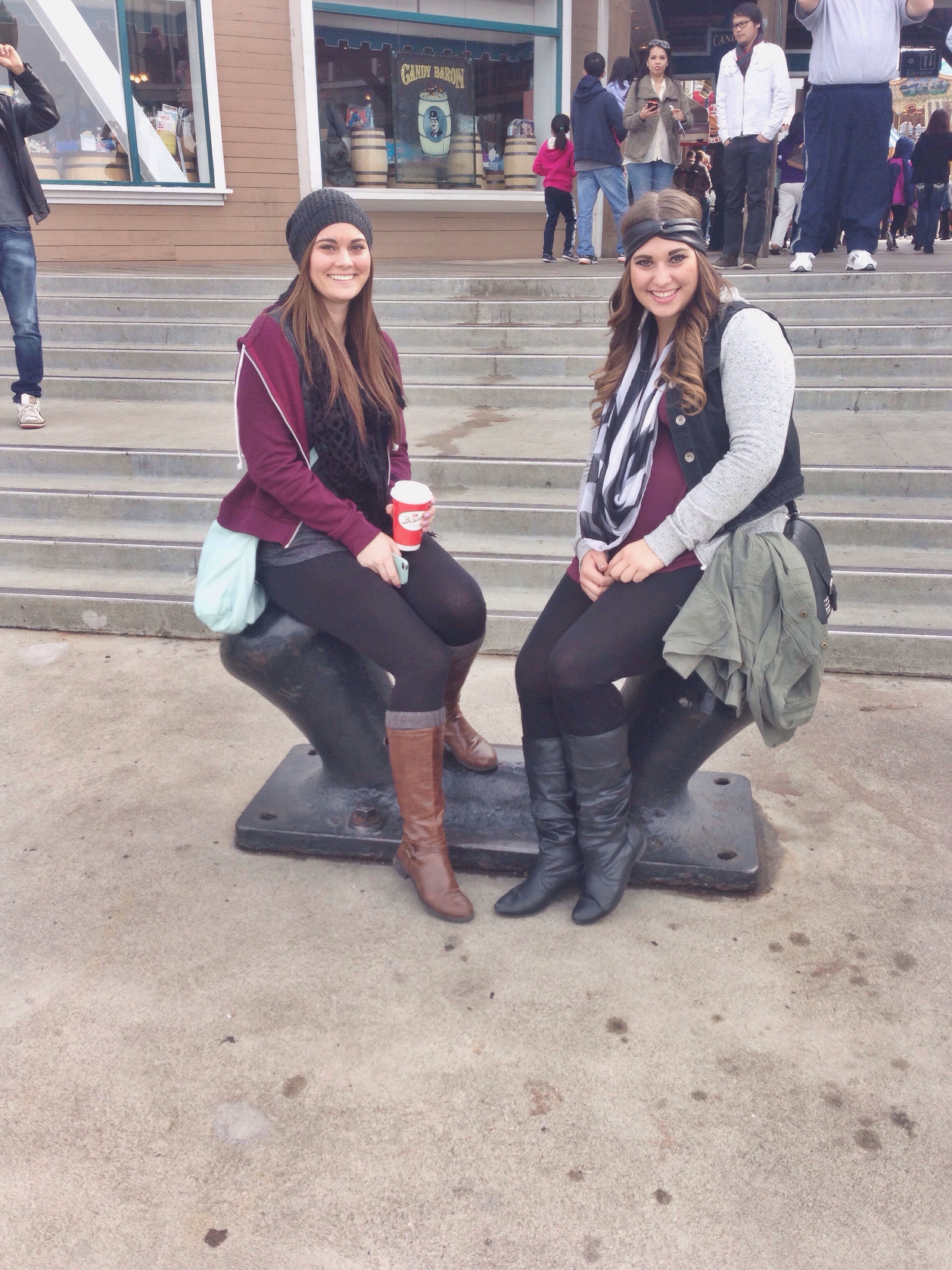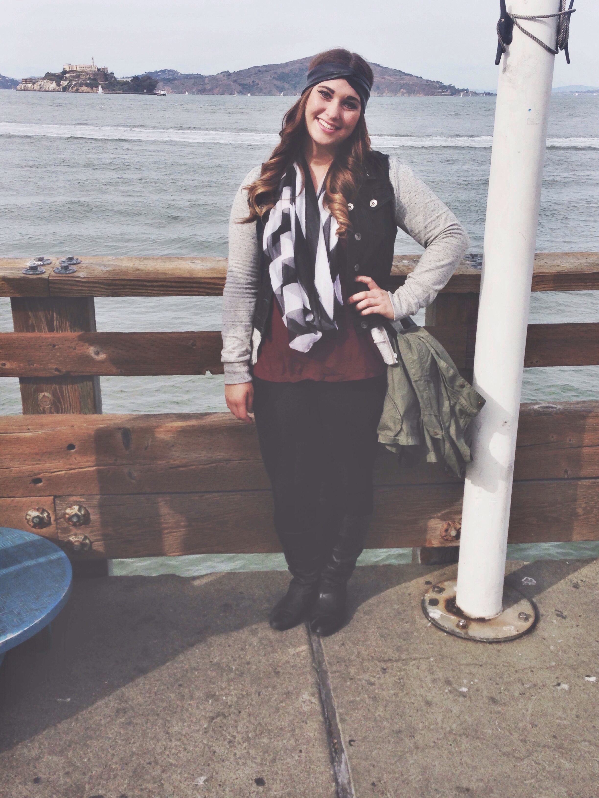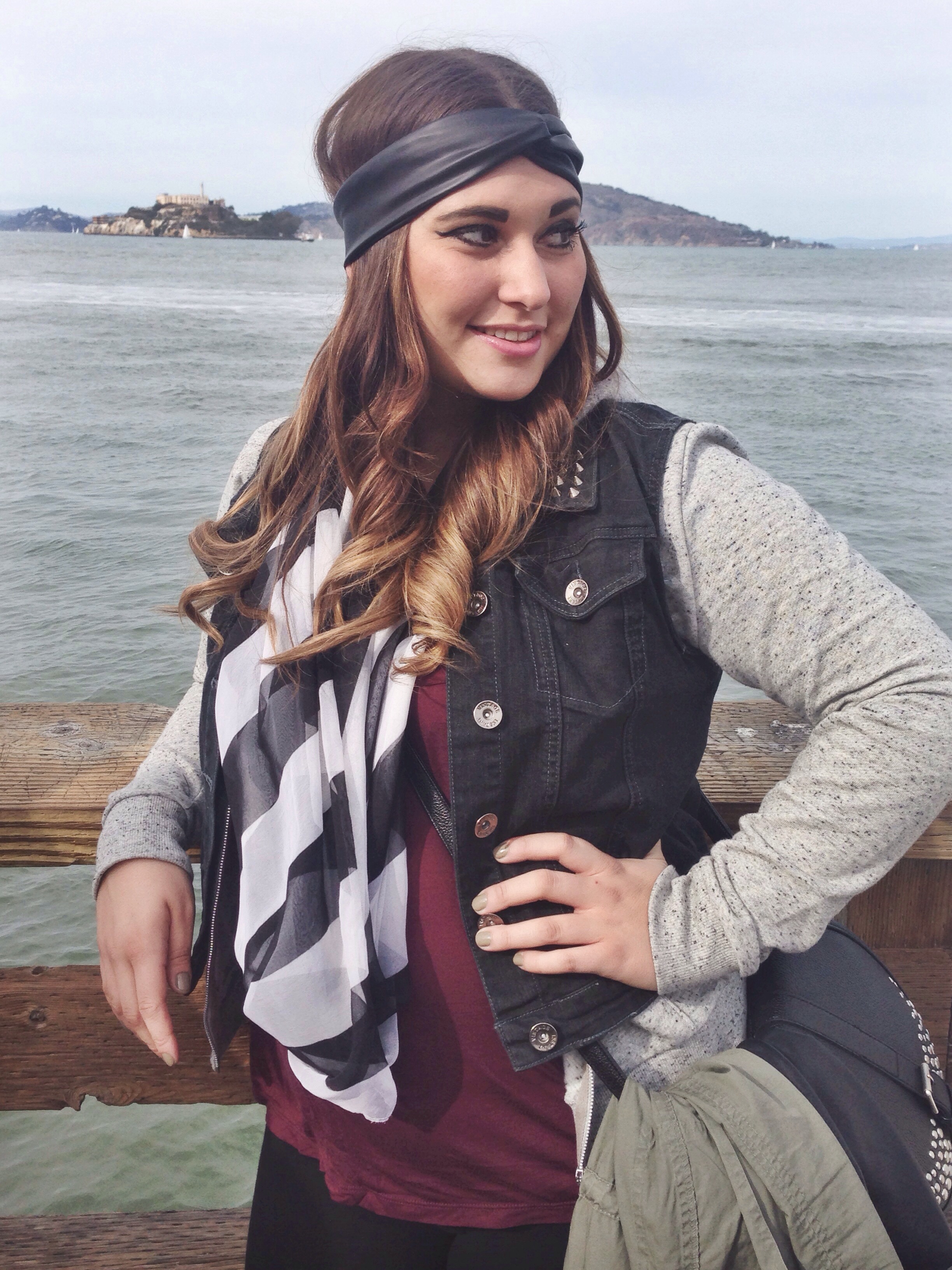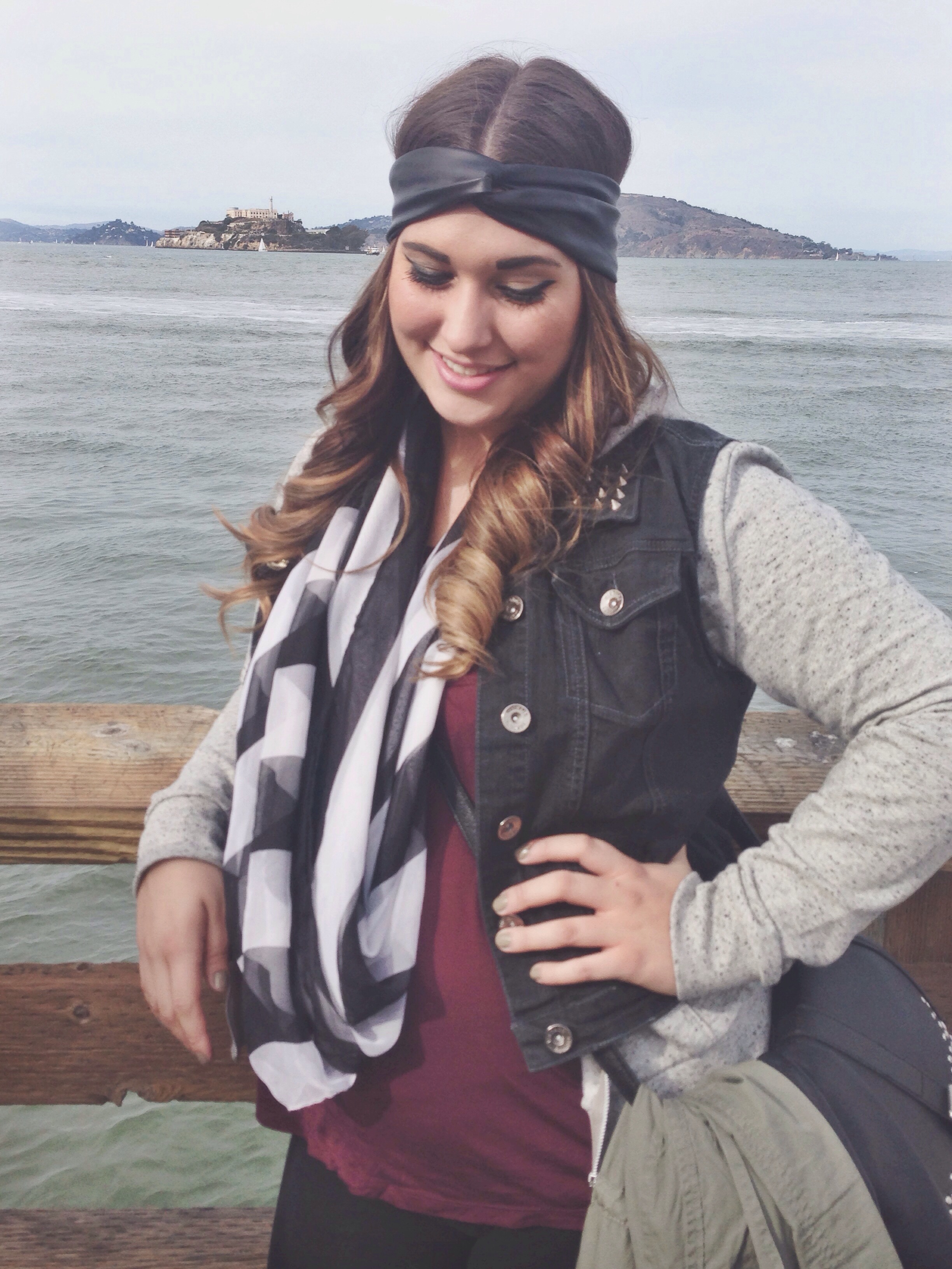 And here’s my outfit! I love dressing “trendy” whenever I go into a coooool city. Haha just kidding, but what the city wears definitely goes through my mind as I pack. I ended up layering like crazy because you never know what the ocean breeze will feel like. So I ended up with a basic maroon tee, some black leggings, a faded grey hoodie, a black Jean vest, a sheer black & white striped scarf, leather boots, & to top it off, literally, my most favorite leather headband that I ordered from the most fabulous shop, Monroe & Harlow. I love this lady & her products! Please go check it out! PS, they make mama & baby headband sets! So adorable!