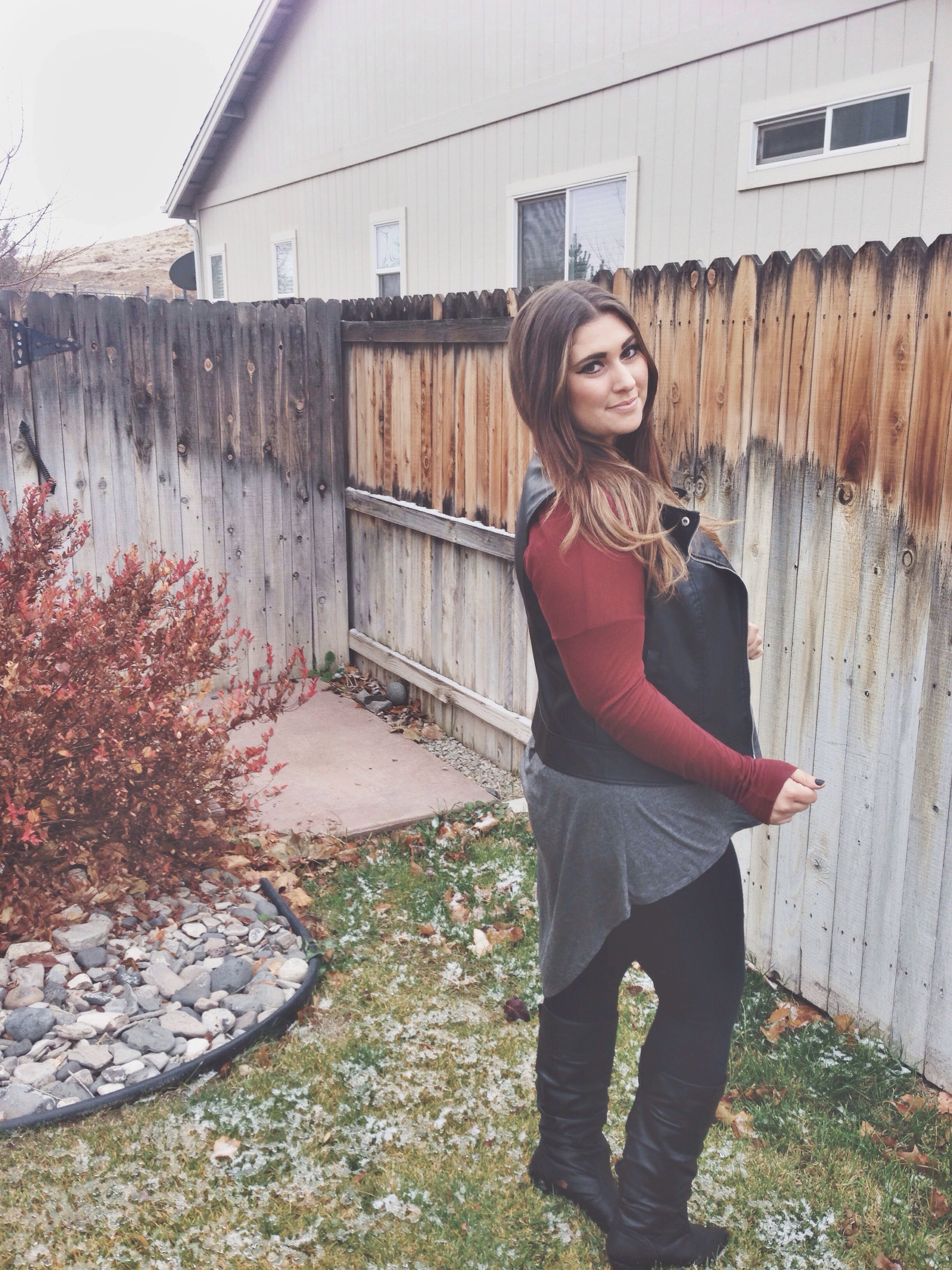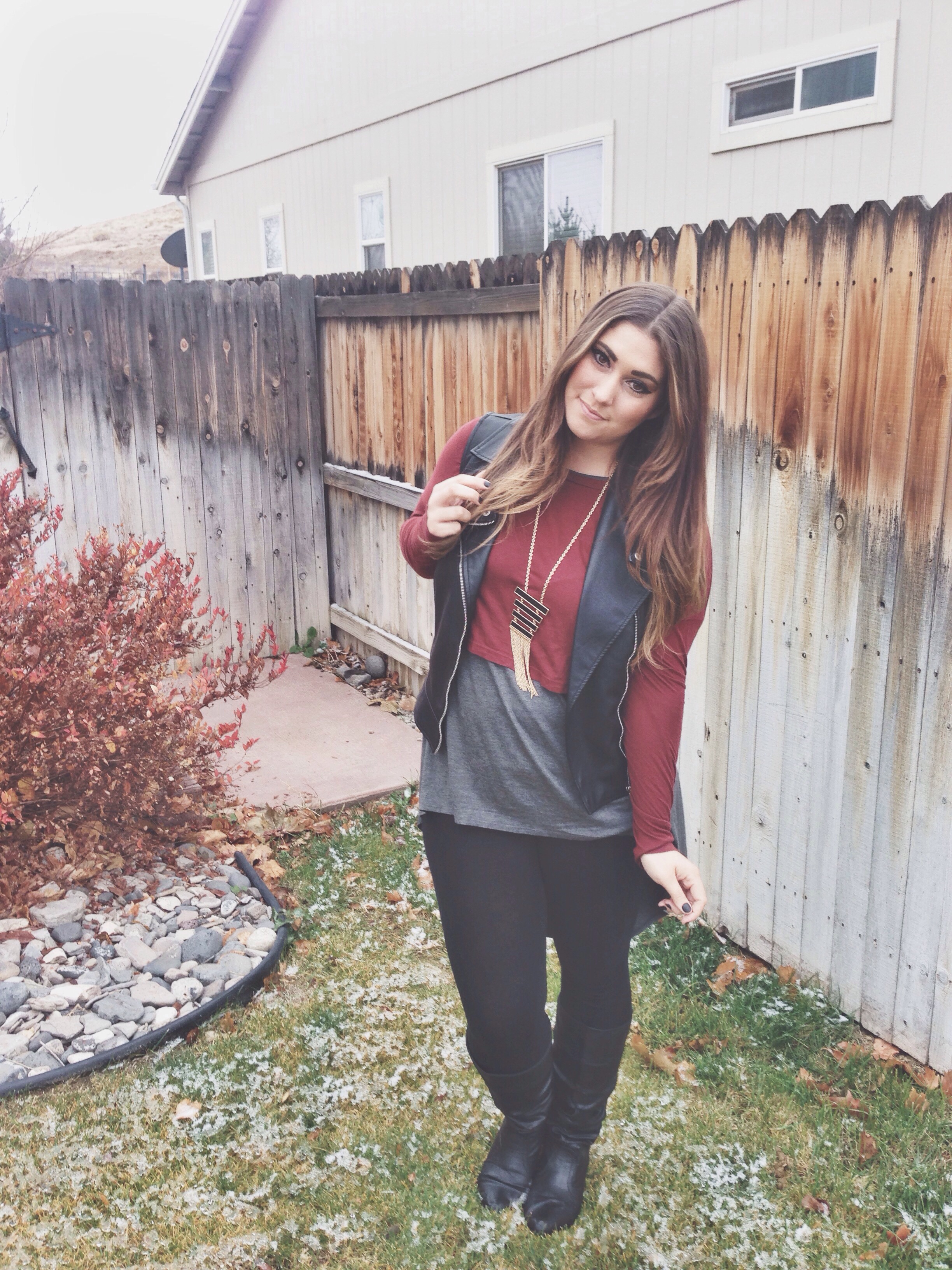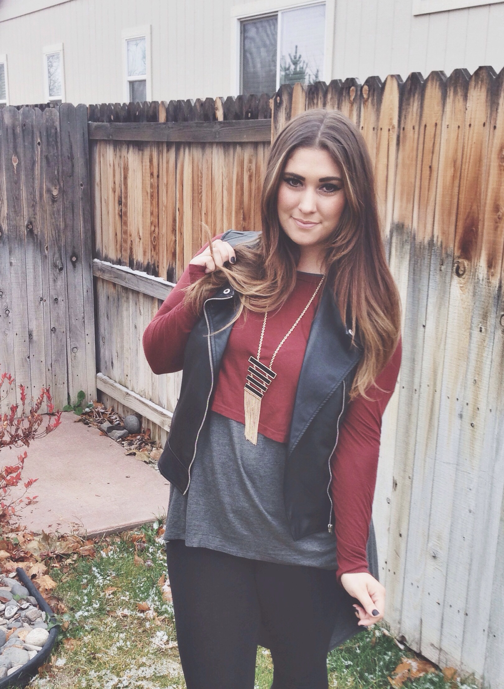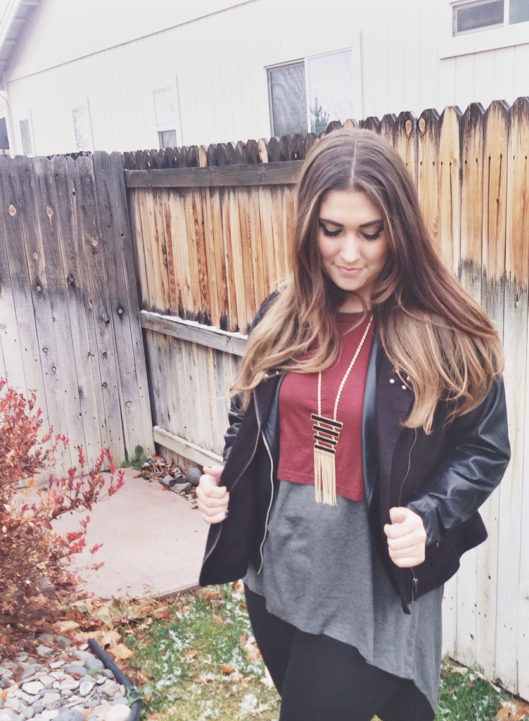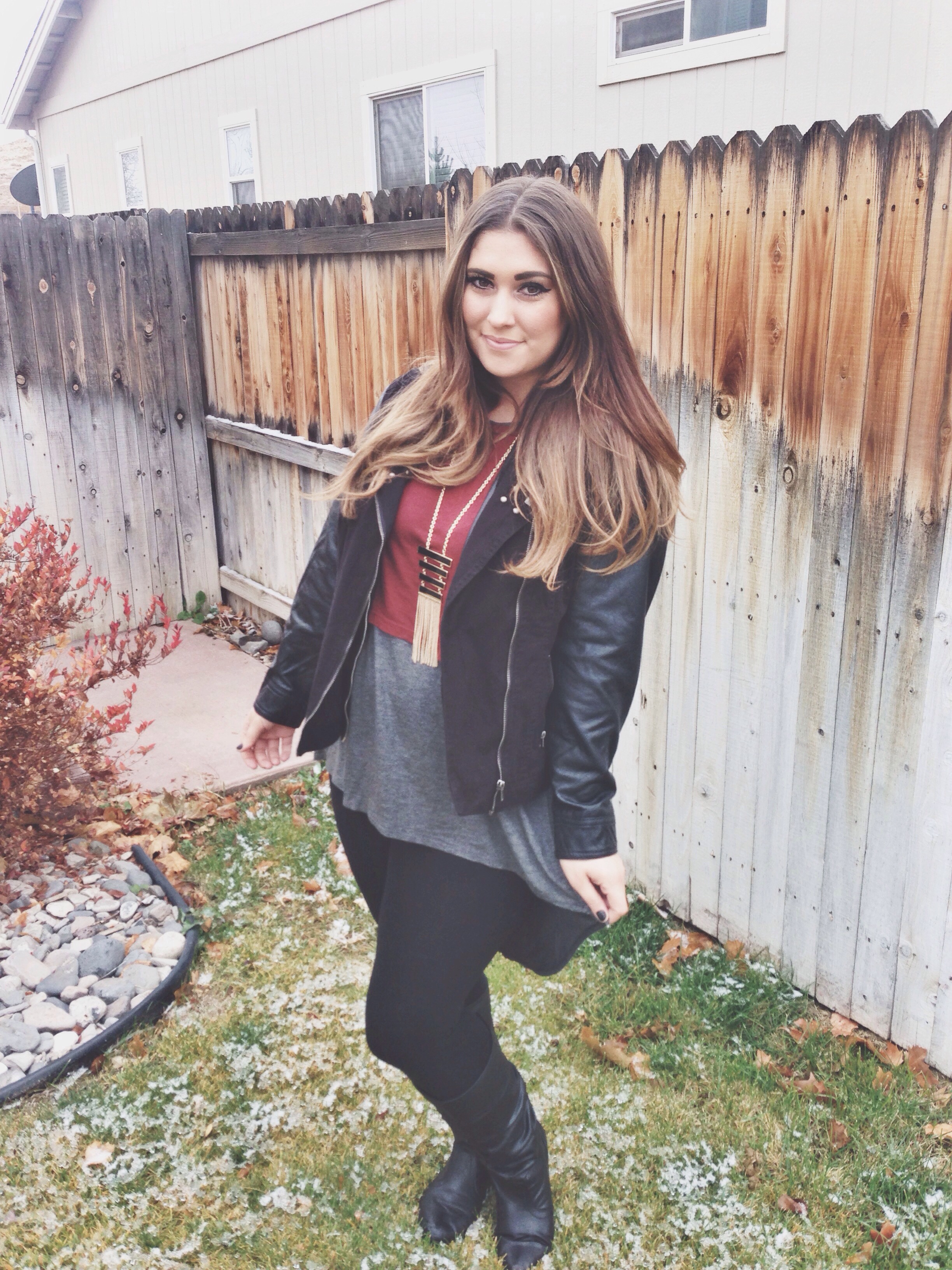 Let’s talk about the best outfit of my week! Yesterday I participated in the #coasttocoastchallenge where the challenge was all things grey! Totally up my alley because lately I love grey, & black, & all things dark. I never know where my outfits are gonna start or where they’re gonna end, but I know when they are complete. I sound like a wisdom giver, which I am not! But possibly a fashion guru.. Anyway, this outfit started with black leggings, then trying on a few of my grey tops. I landed on this deep grey high to low cotton dress & since it was freezing yesterday I needed some sleeves for it! So I layered a maroon crop top over it & I loved the colors & the look. But I wasn’t done there! It needed something more… It needed my leather moto vest & black leather boots! And of course my favorite new necklace from Forever 21! Now it was done & ready for lunch with my mom. See, complete!