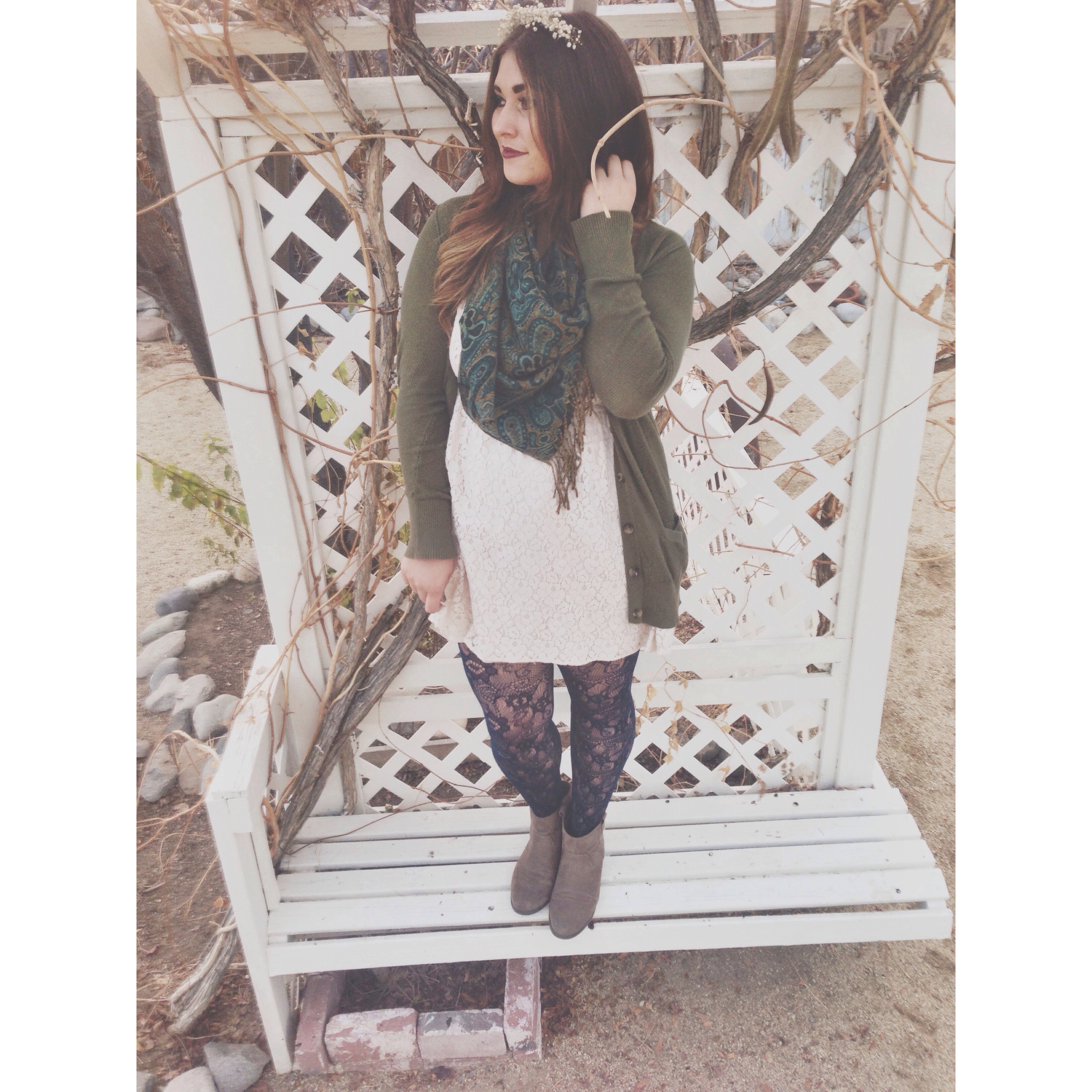 Cream Dress; Ross Cardigan; Target Boots; Target Scarf; Israel Tights; Ross Floral Crown; DIY
