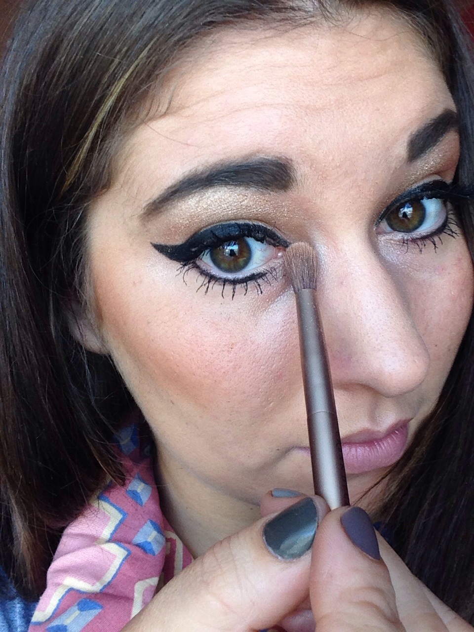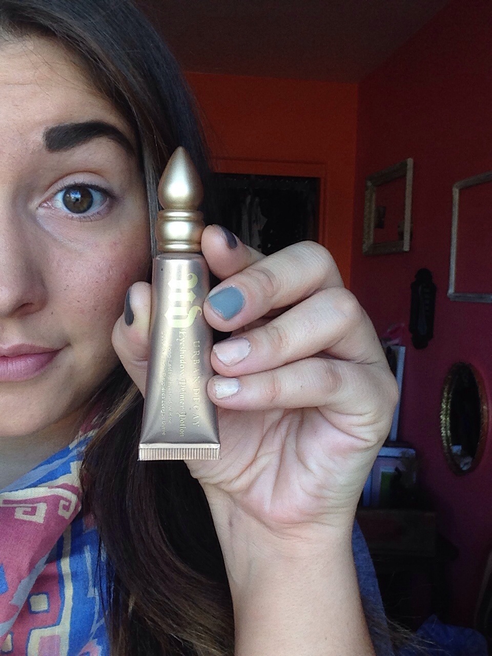 Once my brows are all filled in I prime my eyelids! I’ve been using for quite some time Eyeshadow Primer Potion by Urban Decay in Sin tone. I love the shimmer it leaves behind & the bottle lasts forever. I just squeeze out a pen point size amount on my finger and apply it all over the surface of my eyelid from eyelashes to brow bone, and inner eye to outer. This product works great!