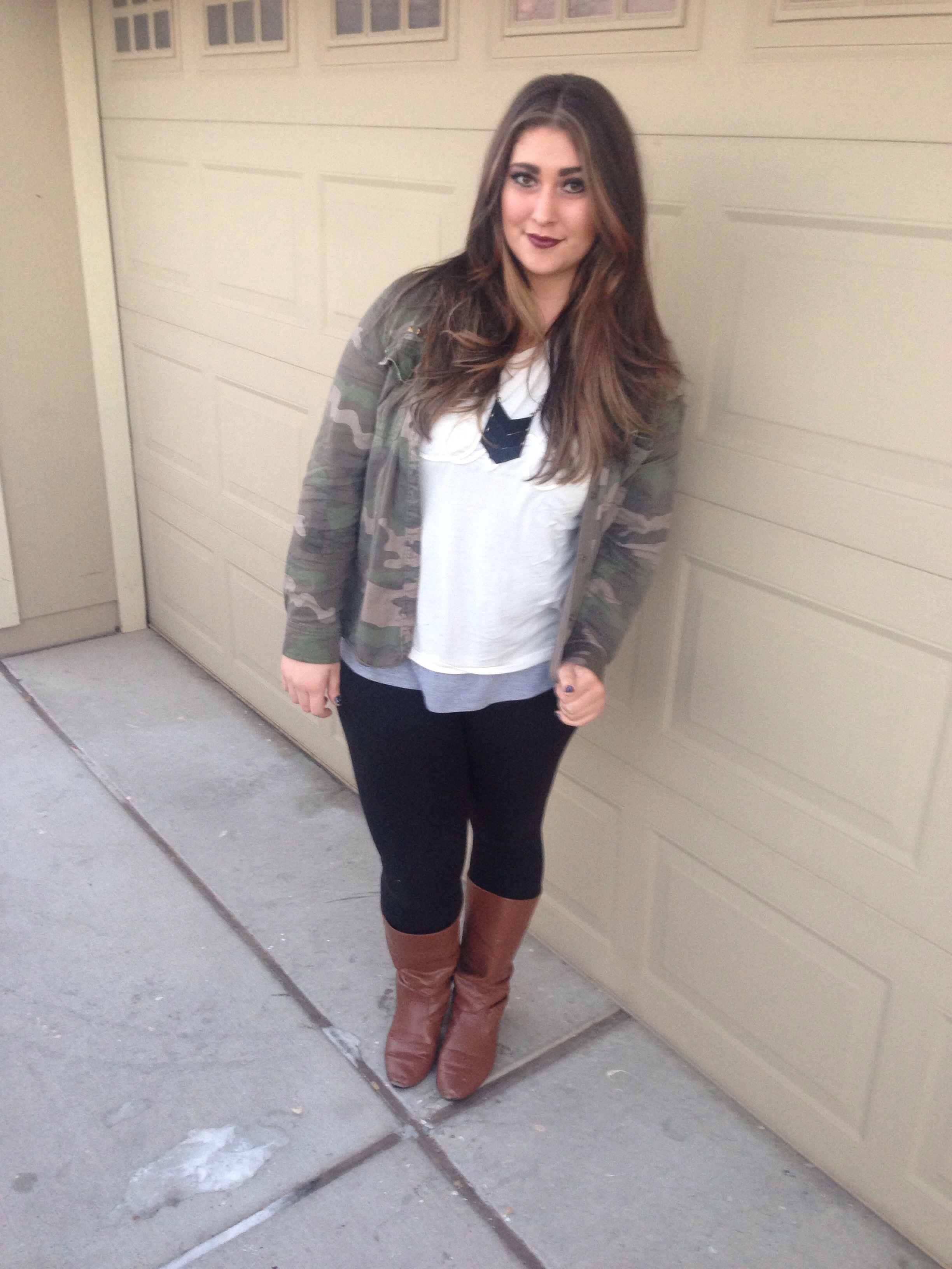 Camo Button Up; Kohl’s “Love” Tee; H&M Grey Tank; Target Leggings; H&M Boots; Mall Store Sunglasses; F21 Black Chevron Necklace; Swallow’s Heart