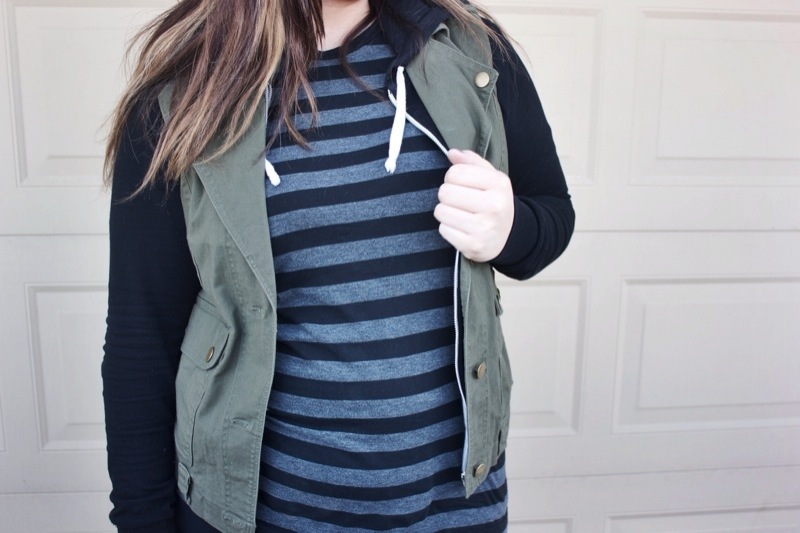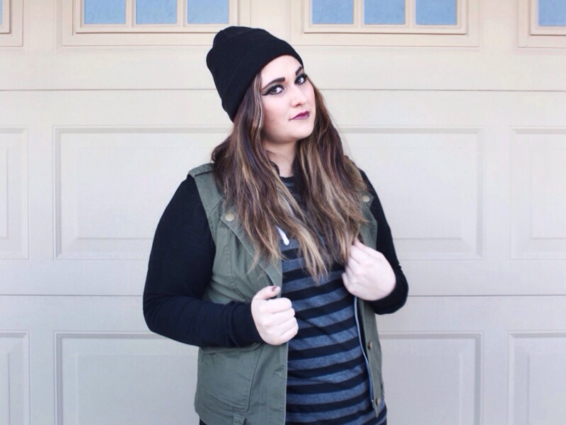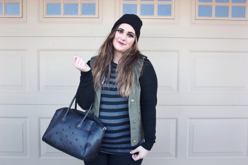 Beanie; H&M Hoodie; H&M Bag; Ross Booties; Sears Tee; Plato’s Closet Vest; F21 Leggings; Hello Apparel