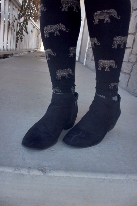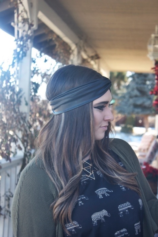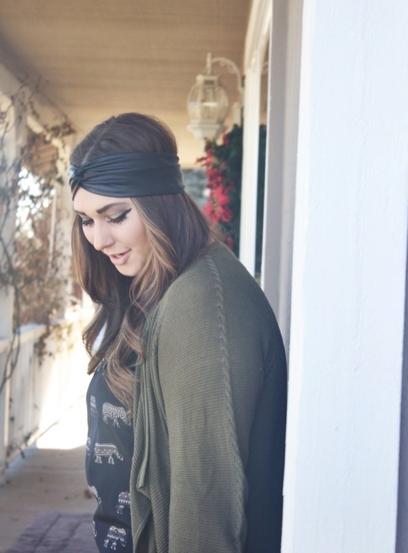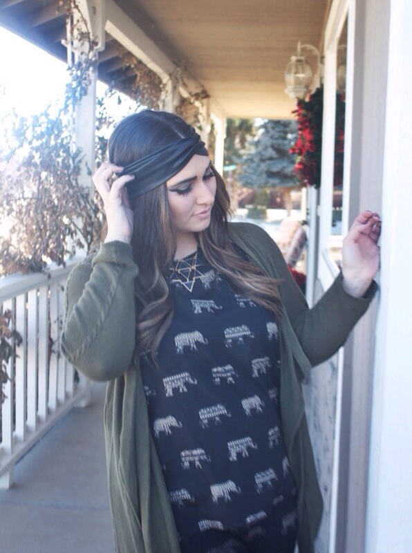 Let’s talk about my most favorite animal ever, elephants! I love monkeys too, but elephants have been on my mind lately. I saw one at the zoo a few weeks back & I wanted to pet it. They’re so beautiful & big! I love em. I’ll even wear em. This last summer I saw a top at Forever 21 with elephants all over it & I couldn’t stop myself from buying it! Then a few months after that I was shopping once again at Forever & my friend Mia, who worked there at the time, showed me a pair of leggings with the same elephant print all over them. I died right there. I bought those things so fast & couldn’t wait to pair the two pieces together to create a jumpsuit look! Yesterday I practiced that look & styled it with a waterfall cardigan & leather turban headband. Jumpsuits are hard to fit into for a wide hipped big bootied girl like myself. So tricking the eye by wearing two matching pieces totally let’s me wear the style & feel good doing it. Yesterday, I felt pretty too. That was my main goal for the day, to feel pretty. Lately my outfits seem to be rough & tough & edgy. Which is fine & I love that look, but I wanted a more feminine look & my fake elephant jumpsuit helped me get there! What animal “prints” are you brave enough to wear? Leave me a comment below!