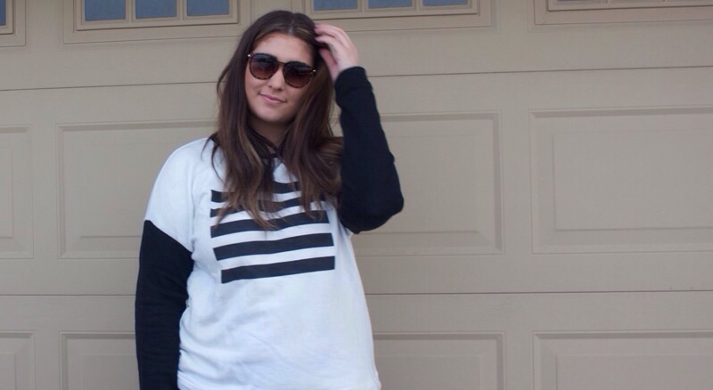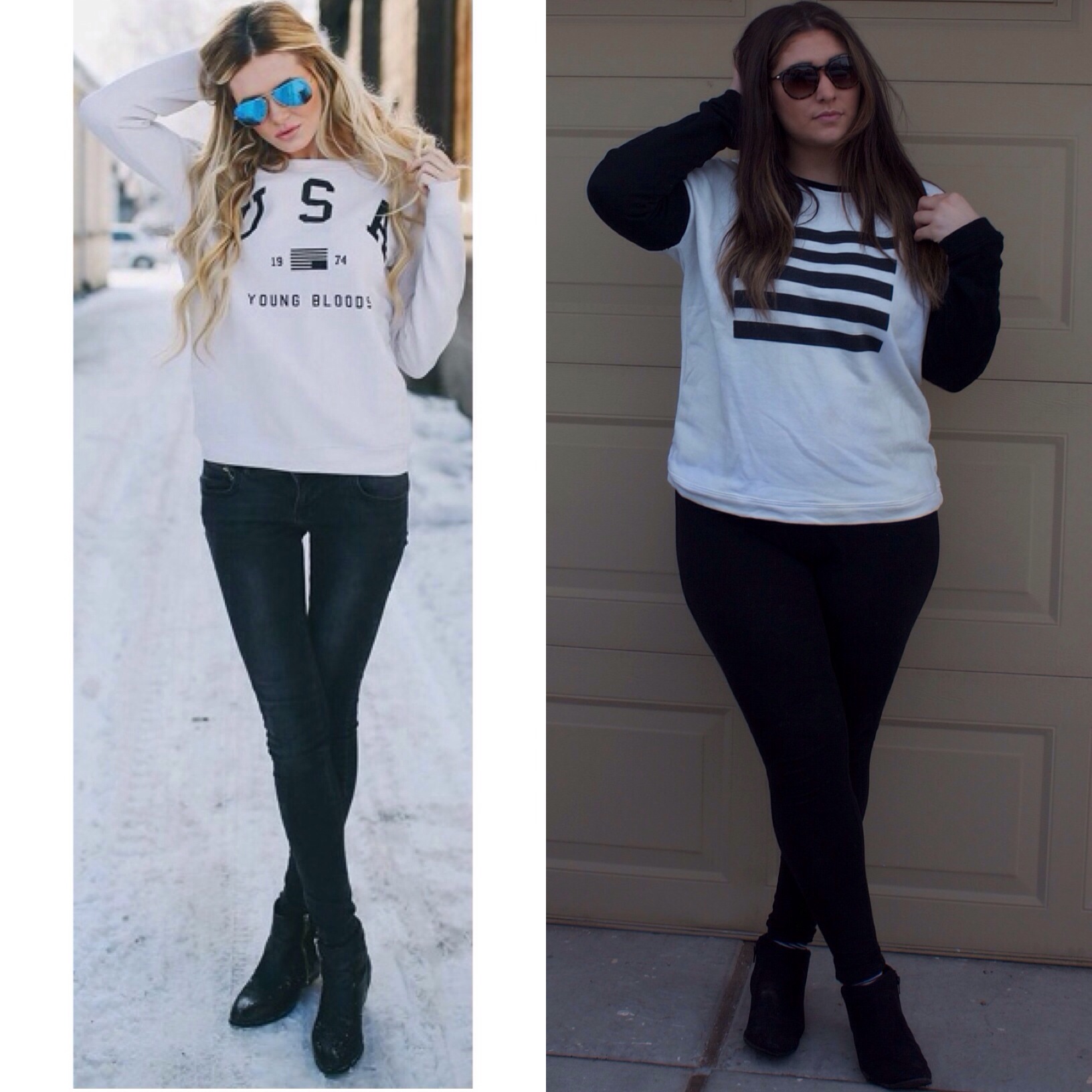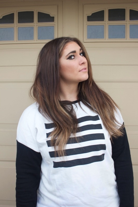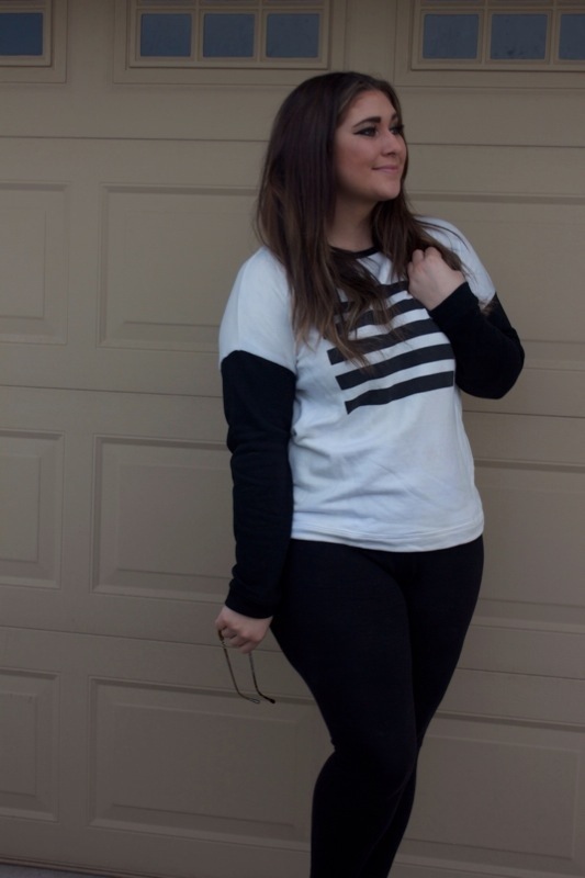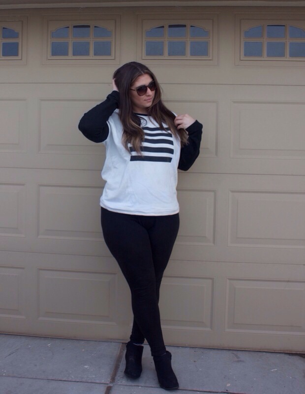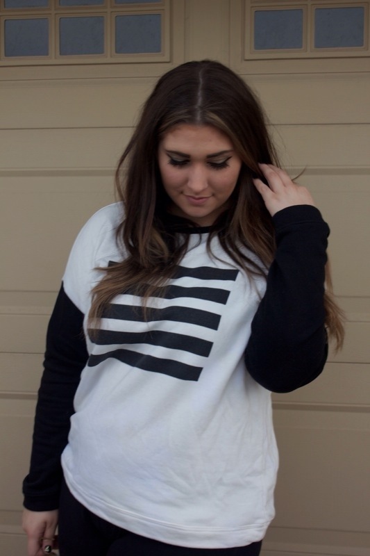 Let’s talk about sweatshirts & how they can be glamorous. I remember back in high school when I played softball we would have to wear sweats on game days. All the girls on my team would say I looked fashionable even in a sweatshirt & sweatpants & they always wondered how I did it. Well, ladies there’s no trick to it. A sweatshirt can look good, it’s just depends on how you wear it. Yesterday for my last day of my Pinterest outfit challenge I wore a crew neck sweatshirt. The original outfit had a sweatshirt with an American flag on it & I knew I had a similar colored one with stripes. I was stoked to copy this outfit. It was so comfy, but still looked glam. Ladies, sweatshirts can be fashionable as long as you still do your hair/make-up for the day! Simple look yet it’s put together.