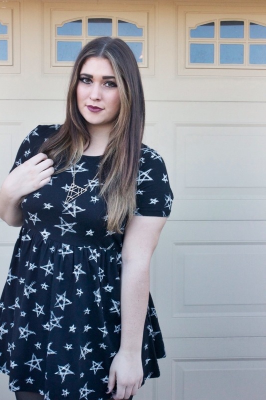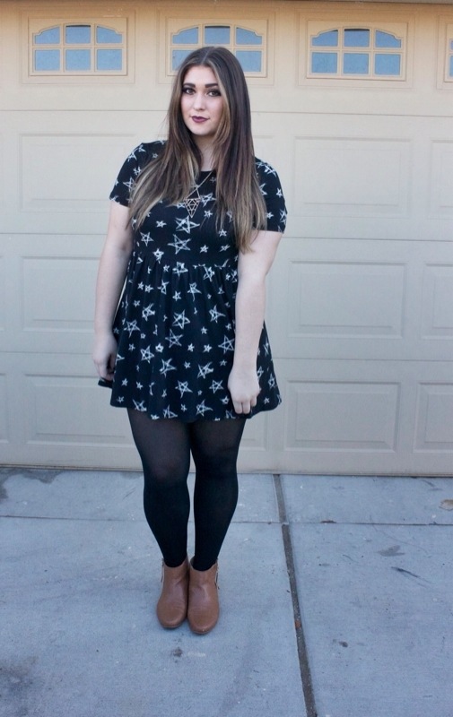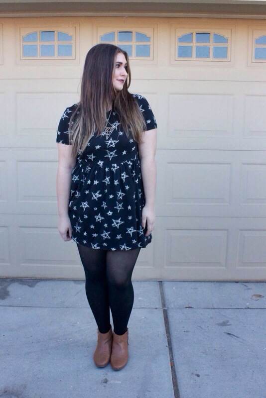 Let’s talk about my new dress that I got at Forever 21 last weekend for only 4 dollars. It’s a black cotton dress with white hand drawn looking white stars all over it. When I first saw this dress I was so shocked that I liked it because I normally don’t like stars on clothes at all. Unless it’s the 4th of July of course. I just think the pattern can seem so tacky & childish. Ya know what I mean? Like rainbows & unicorns & mystical things. Haha, I don’t know. That’s just how my head has always viewed the shape. But I loved this dress! The pattern was so different than anyone I had honestly seen. I was like I cannot believe I’m buying this! But I did & it was the cutest dress ever yesterday with a pair of simple black tights & tan booties. I call it my Death Star dress even thigh I think Star Wars is lame. But I looked deathly good in this dress & it has stars on it. So that name is perfect, right? Yes.