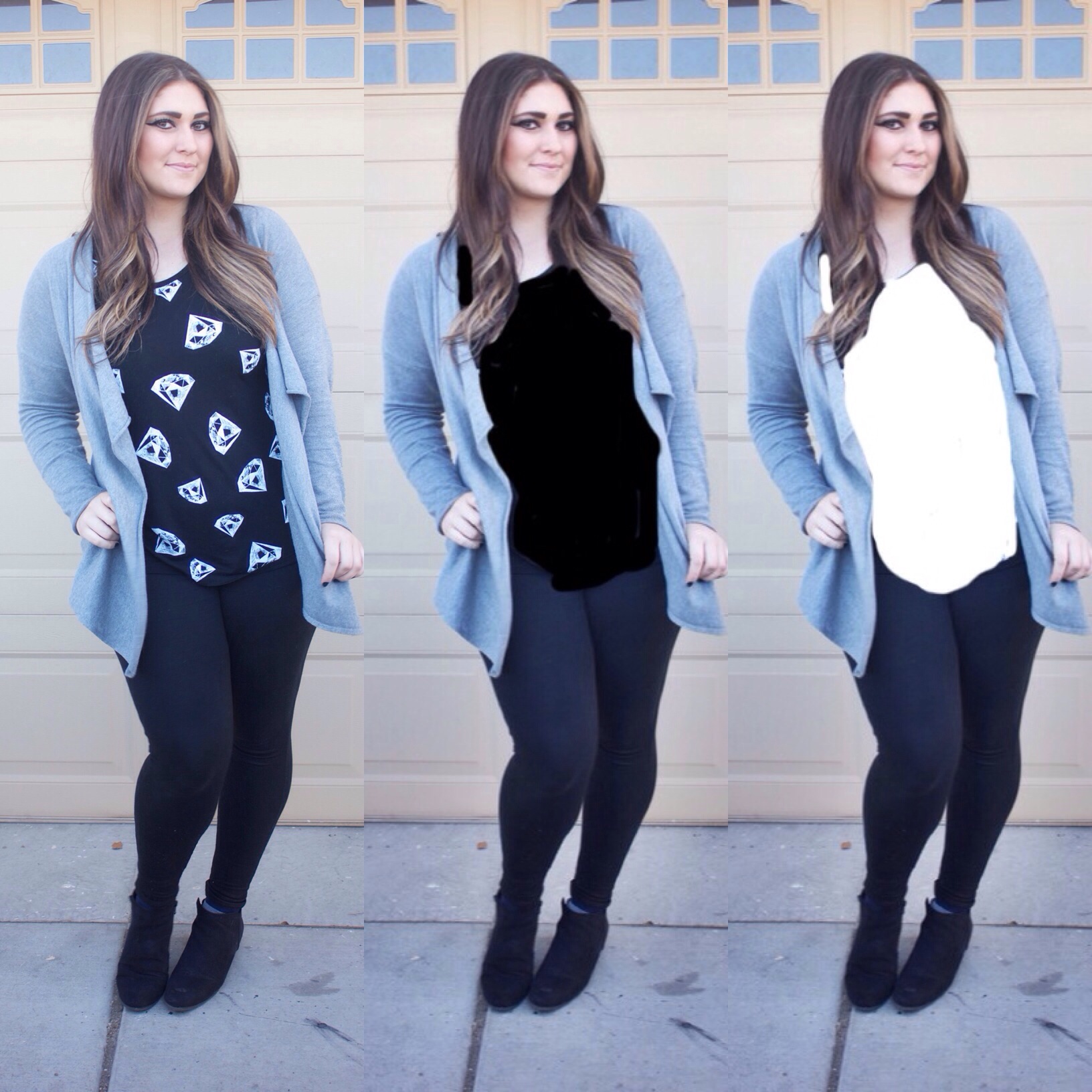Here’s a silly (photoshopped) example, but it proves my point! The patterned top is way cuter than the plain tops. I love black & solids, but they don’t always do the trick. Buy patterns ladies, they never disappoint!