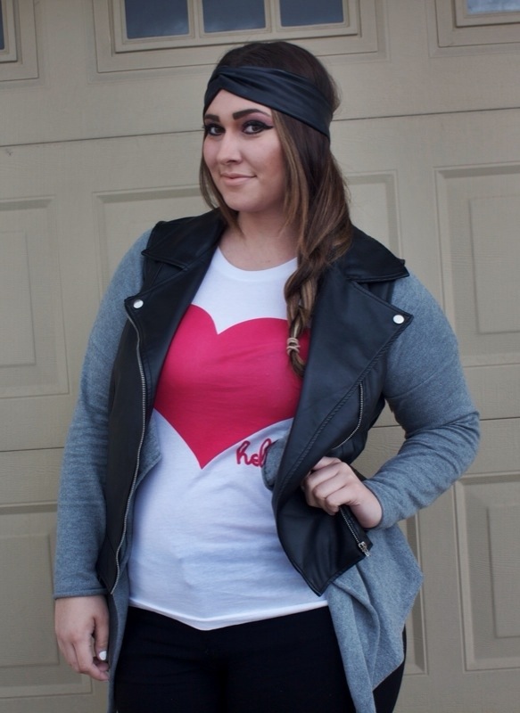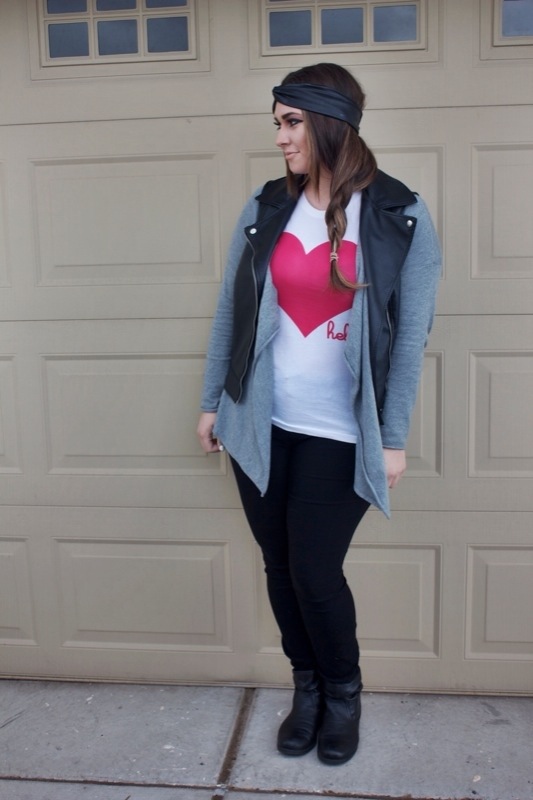 Grey Waterfall Cardigan; H&M Skinnies; Burlington Coat Factory Moto Booties; Ross Vest; F21 Heart Tee; Hello Apparel Leather Turban Headband; Monroe & Harlow