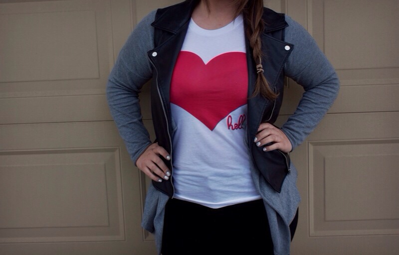 I love t-shirts. They’re the best thing in my wardrobe currently. They’re just so comfy & stretchy & they hold the ability to express whatever you want the world to know about you in one simple look or phrase. Think about it. That’s a lot of pressure for a single tee to live up too, huh? To express you entirely by a mere glance. It’s true though. T-shirts are completely different than a plain shirt of blouse. A t-shirt talks. It’s talks by it’s print. It’s talks by it’s graphics. It talks by it’s tone. A t-shirt can have an entire conversation with a passerby & not a word has to be spoken. Some of my favorite tees that talk are by the online small business, Hello Apparel. They’re from Arizona & they make some of the best graphic tees around. Their known by their famous cursive “hello” logo printed on tees & crewnecks. Lately, they’ve been broadening their products & have been designing for holidays & using other types of graphics/phrases. Their latest hit is a simple white tee with a giant red heart smack in the middle of it for Valentine’s Day. Such a bold thing to wear quite honestly. But me being a loyal customer, I bought it of course. And upon arrival I instantly loved it. Spoiler! I love all their tees, let’s be real. So I styled the tee & cannot wait to wear it again & in a completely different way. This tee doesn’t just shout “hey, I’m a big red heart in the middle of your chest that represents a holiday filled with candy, cards, & stuffed cheesy bears, & I suppose some love too.” Haha to me, this tee screams color. I never wear much color, but here it is. A big love shaped blob of color. Maybe one day it’ll represent actually “love” in my life. But until then, it just says color.