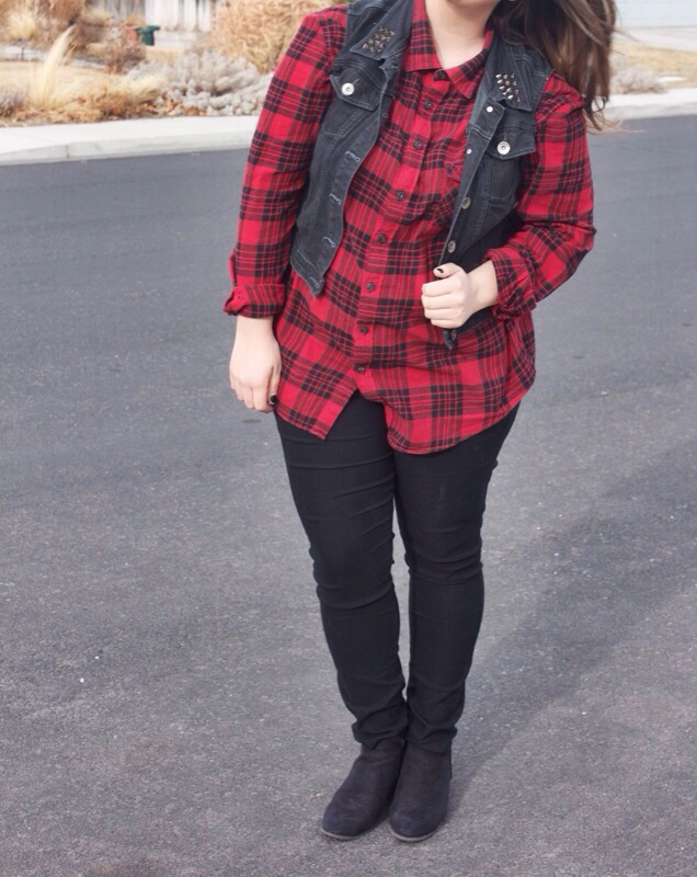 Flannel; Target Skinnies; Burlington Coat Factory Denim Vest; Burlington Coat Factory Booties; Kohl’s