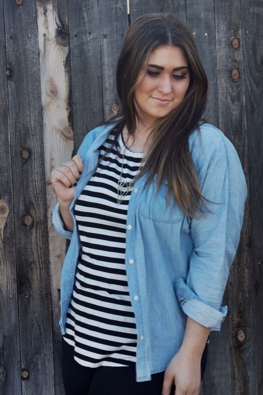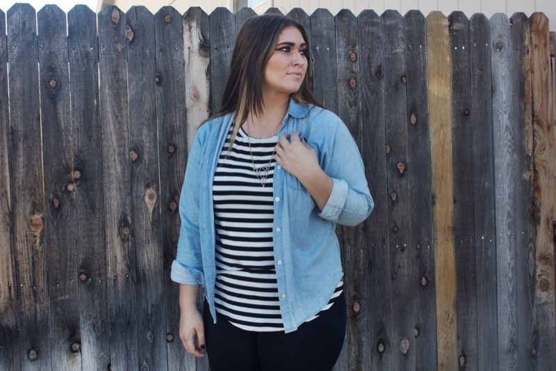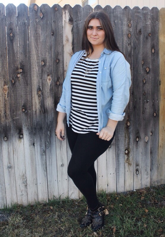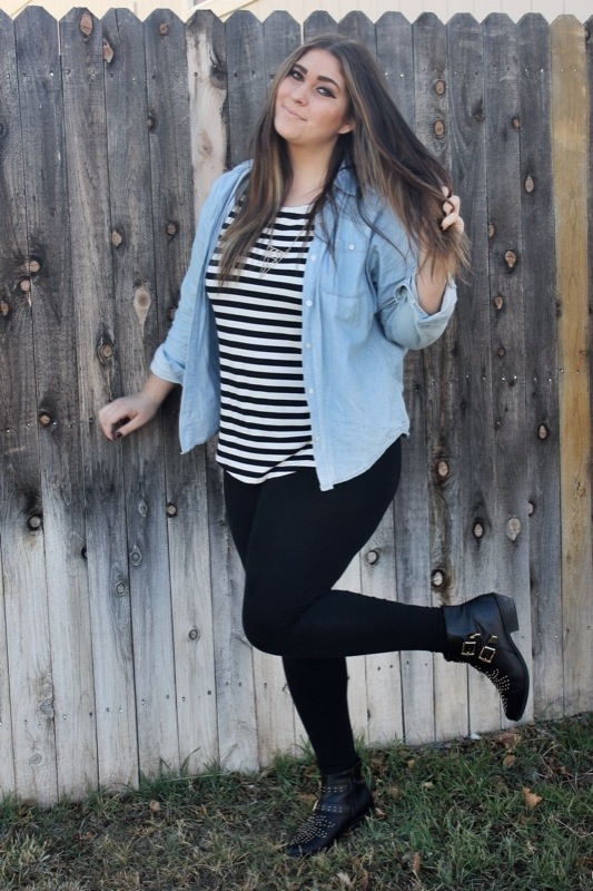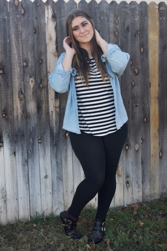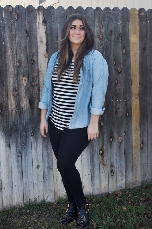 Denim Shirt; F21 Striped Tee; F21 Leggings; Target Booties; F21 Necklace; F21