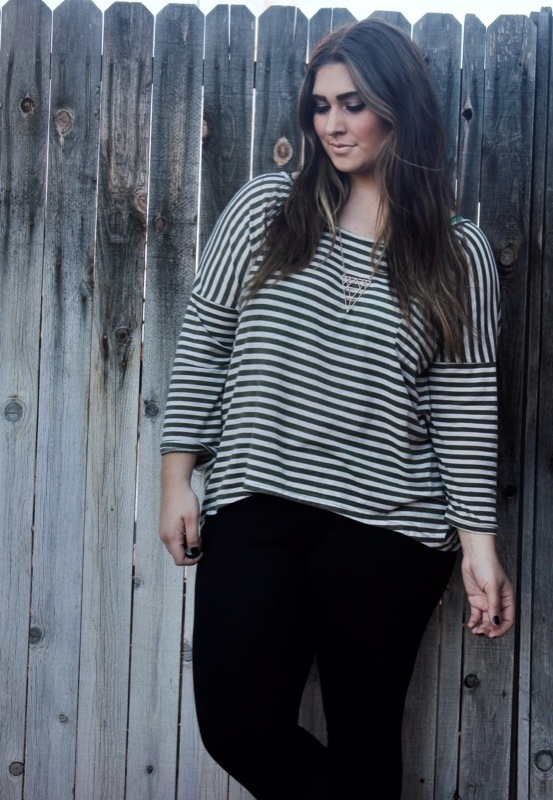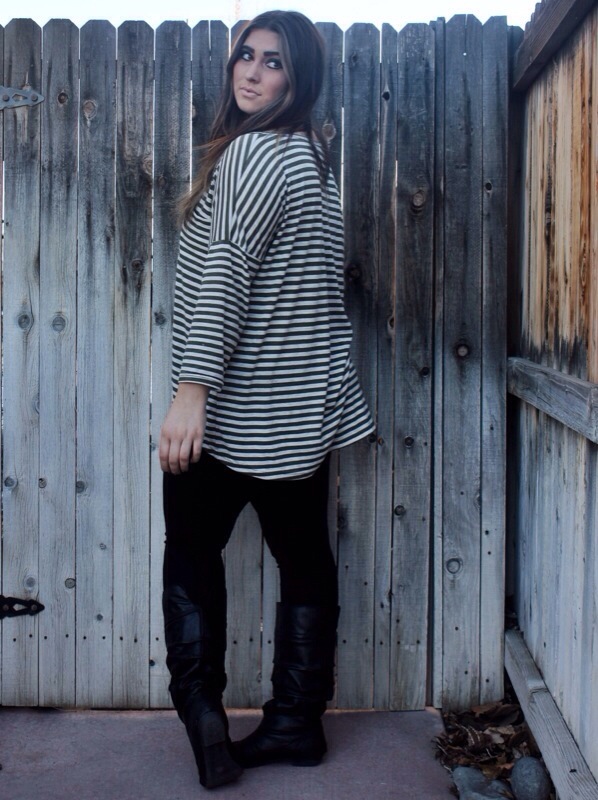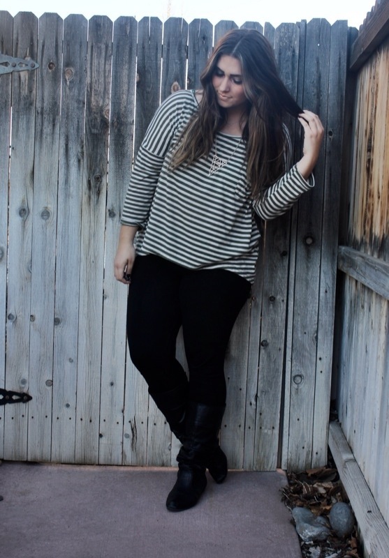 Green Striped Tee; Burlington Coat Factory Leggings; H&M Boots; Kohl’s Necklace; F21