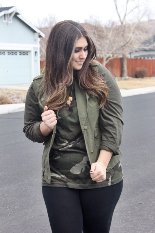 Have you ever thought of pairing the same color pieces together in the same outfit, besides the color black?!? Me neither! Yesterday I got dressed & I knew my outfit needed something else but I wasn’t sure what exactly. I had a camo long tee & leggings on & tonight I best would do. So I tried on every single one of mine, I have like 8! But none of em worked & I was bummed. Until I threw on my military utility vest & bam, totally nailed it! I would have never thought to pair the same military colored greens together but it looked good & I loved the look.