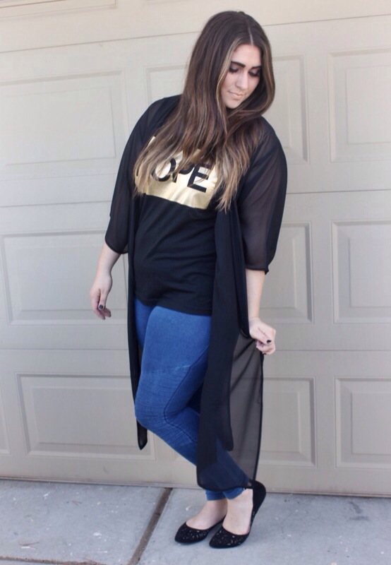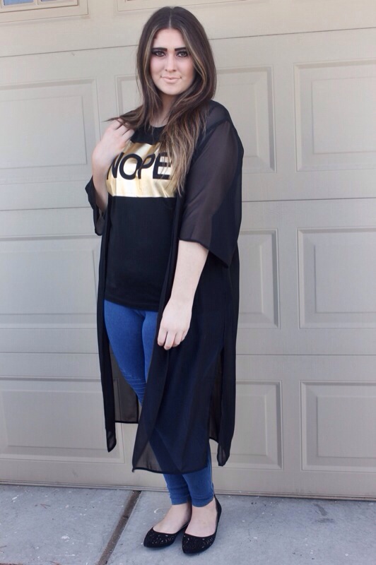 Ima be real with y’all for a bit. Yesterday’s outfit was just too good for a Tuesday. Normally if I put together something snazzy & cute I’ll save it for a Sunday which is when I see people & actually to do stuff. But I put on yesterday’s outfit & just couldn’t take it off! It was just too good of an idea to wait any longer to strut my stuff in it. So I wore it & rocked it & loved everything about it. The shirt cracks me up, because well, it describes my attitude towards everything. I’m a huge second guesser, avoider, & loner. So wearing a shirt with a big ole NOPE on it should really be what I wear everyday to be honest. It looked so good with my new sheer long kimono from H&M & my (on sale!) new blue washed leggings that were from there too. The colors & pieces just flowed, literally. I loved it. Didn’t really love my hair, but oh well! I can’t wait to wear each of these pieces again, but in a different way of course!