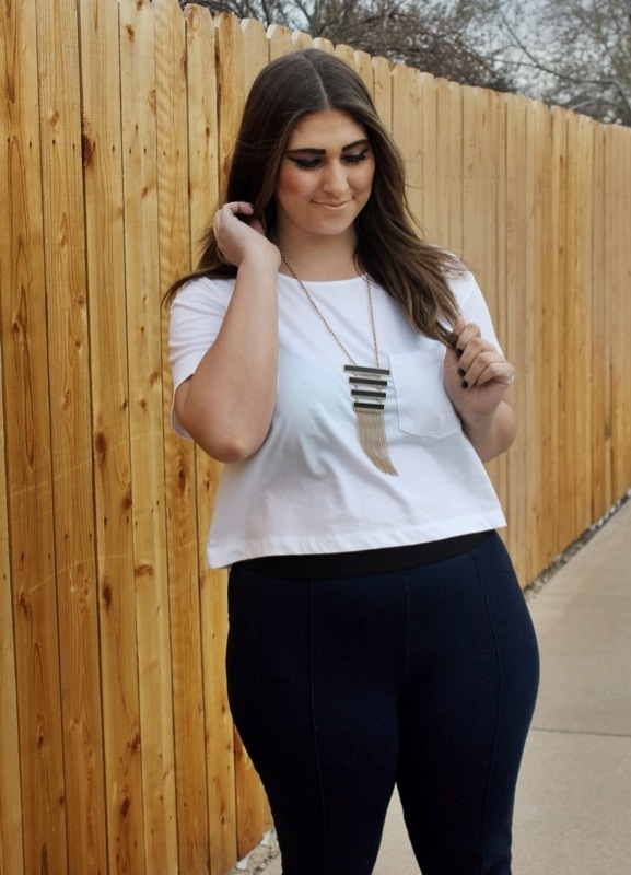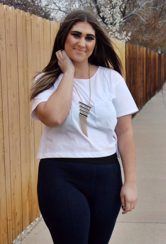 Lately, I have been obsessed with purchasing crop top tees. Upside: they’re cheap! Downside: they can be scandalous! But I love them anyway. I bought this white crop while skimming my way through (one of) my local Forever 21’s. I was supposed to just be there to check out their jewelry since it was on sale that weekend. But of course I can’t focus on getting just one thing… I’m so glad I found this tee though. It’s gonna go so great with maxi skirts & harem pants this spring & summer! It totally made my outfit yesterday too. Denim high waisted leggings & a crop white tee? So good! Simple too, which I am loving right now. Solid colors, shapely pieces, & statement jewelry are making for the best standout outfits lately! The crop top tee is overtaking my closet & I am not fussing over it one bit.