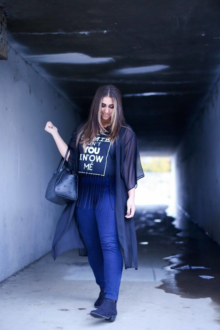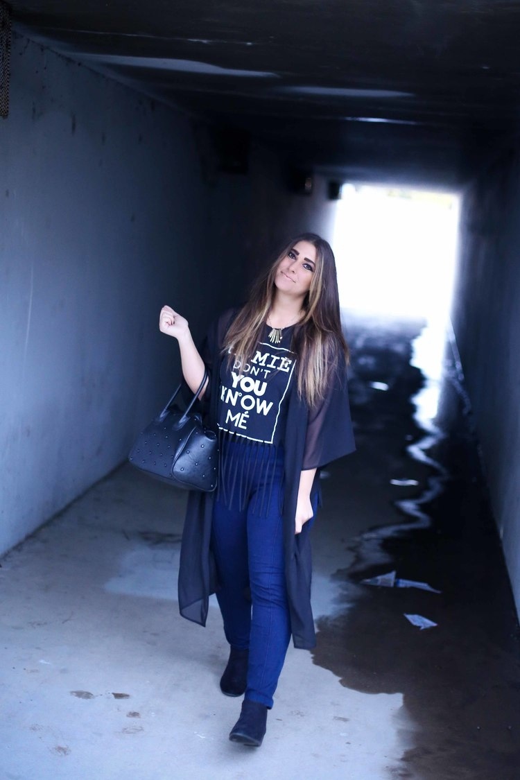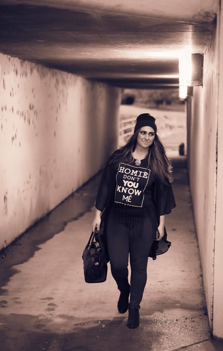 Homie tee; F21 Leggings; Macy’s Kimono; H&M Beanie; H&M Handbag; Ross Necklace; F21 Booties; Kohl’s