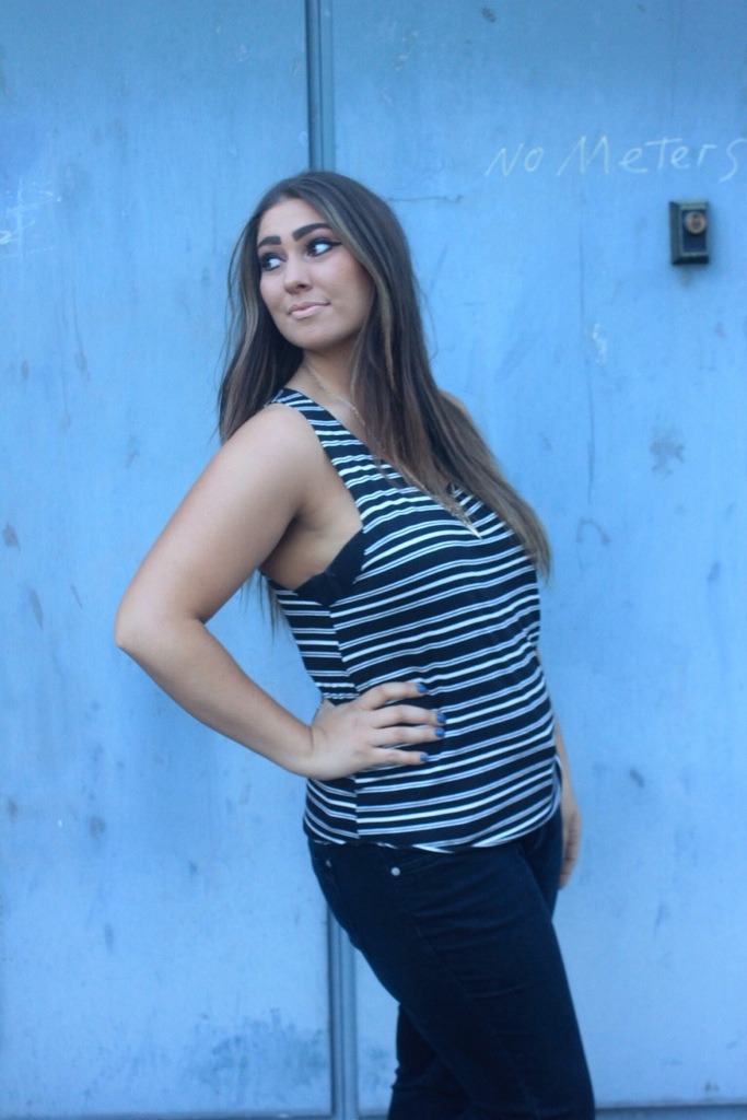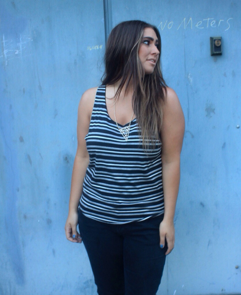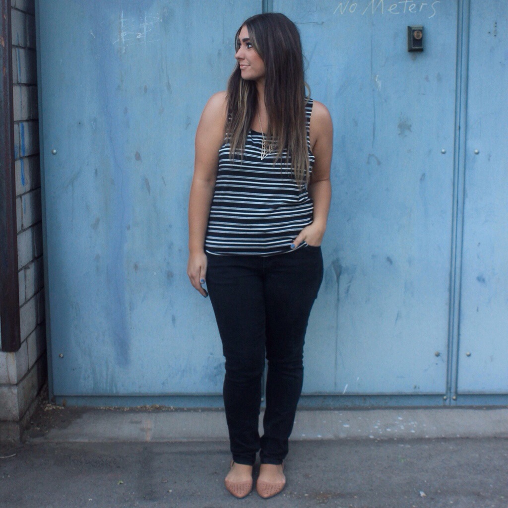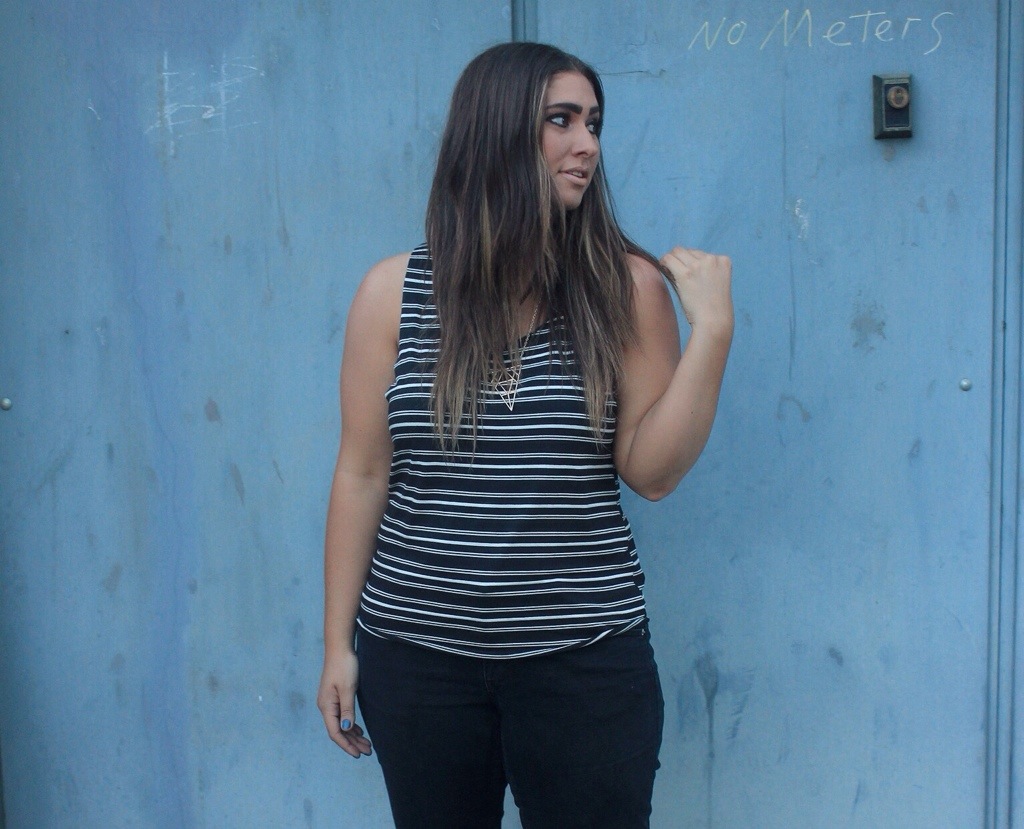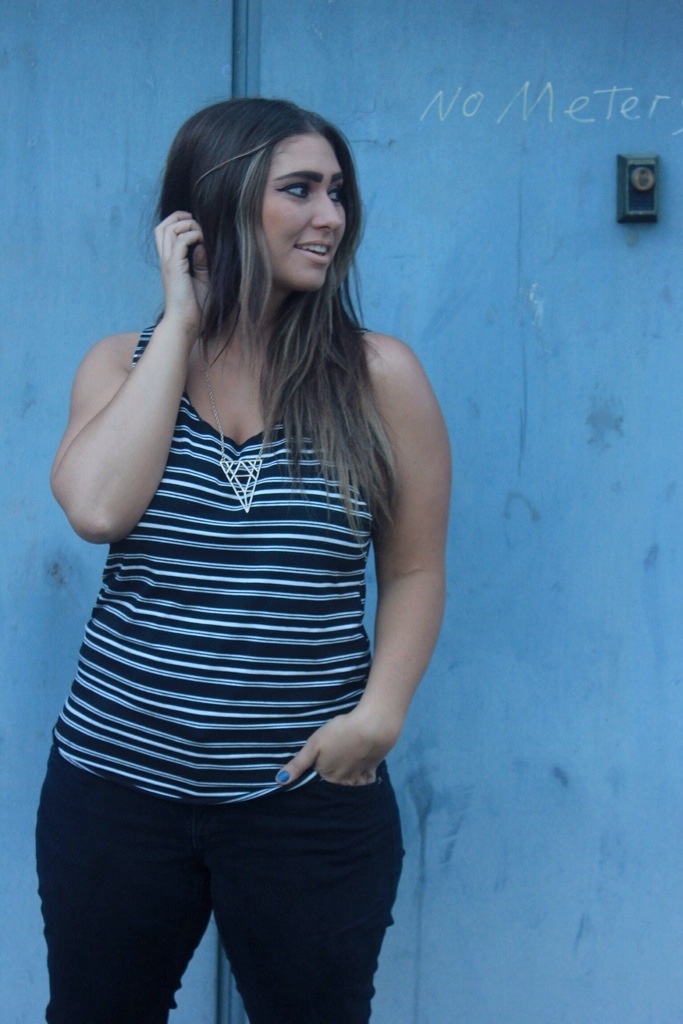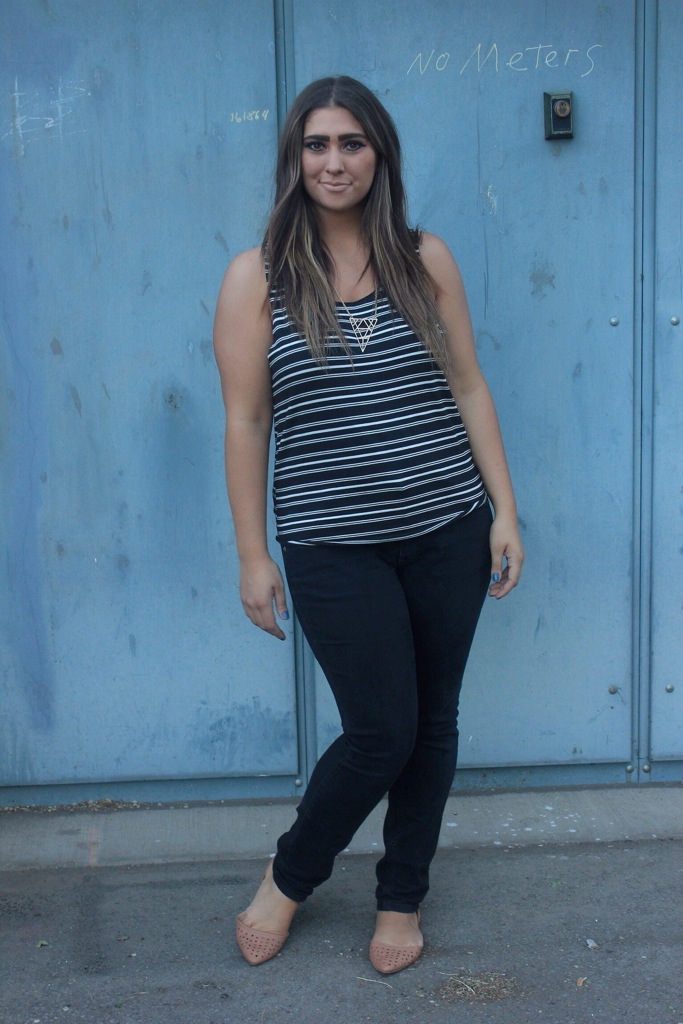 Okay, so maybe color hasn’t quite taken over my wardrobe yet… Because I’m still so in love with the color black, especially in stripe form! There’s just something about it that makes my little fashion heart swoon! So though I am bringing in more vibrant hues, don’t be shocked when I go back to my beloved bold black. I had a college graduation party to go to yesterday & though our weather is getting warmer here in Reno the random wind chills can make it down right bipolar & cold. So sometimes pants are just a good option for a springtime BBQ because you don’t wanna be cold & you don’t wanna have to hold your dress down the whole time. We all know how much fun that can be! So I went with some black skinnies (the ones that didn’t fit, & keep getting looser !!!!), a simple black & white striped tank from Forever 21 & these cute little brown cutout flats that I scored at Ross the other day for just 15 bucks! It made for a super casual but still put together look & was super comfortable for the windy afternoon that I predicted. I went with a wavy hair beach vibe do because it fit the thrown together look of the outfit. Want a quick tip? In my opinion, your hair & your shoes can either make or break an outfit. Don’t believe me? Try it out for yourself. Sometimes an outfit will seem so perfect but it won’t feel quite right when you look in the mirror. So try throwing on a different pair of shoes or switching your hair style around. I promise it will make all the difference! Break out of your norm & see how many times sometimes actually noticed what you did that day. I promise they will & it’ll help you to feel like you can do so more often. I can’t tell you how many times I’ve done just this & the thing I switched around is the exact thing that everybody noticed & loved. It might feel weird at first but just be confident & do it!