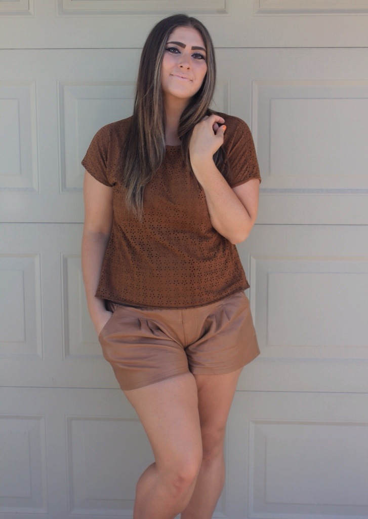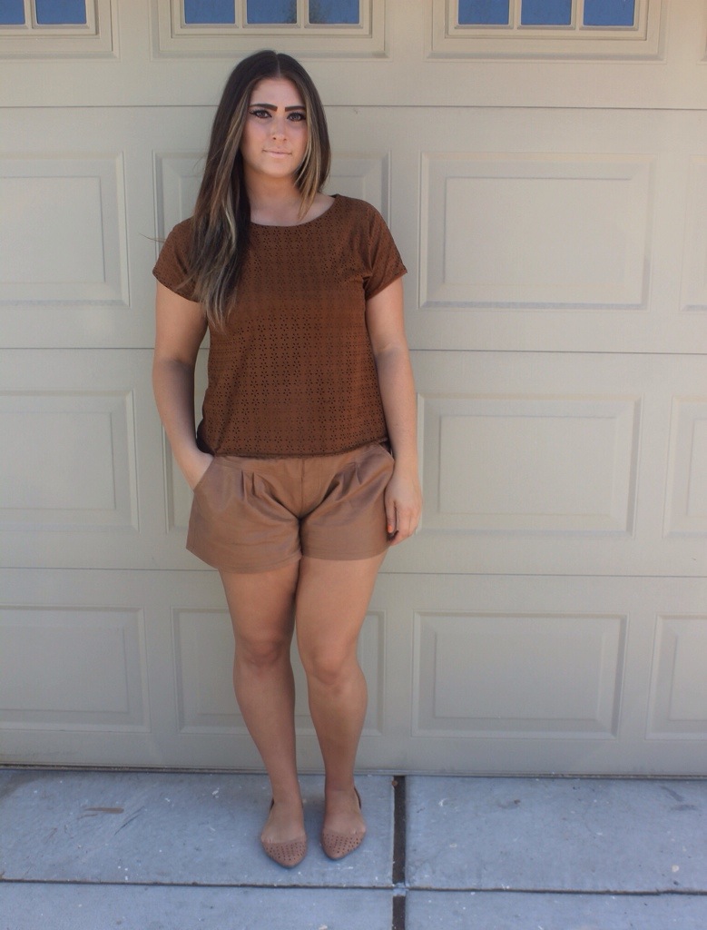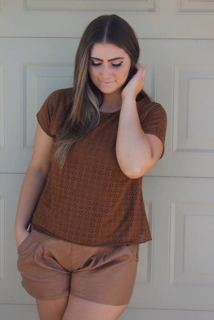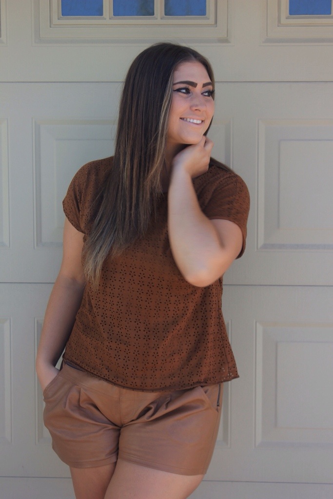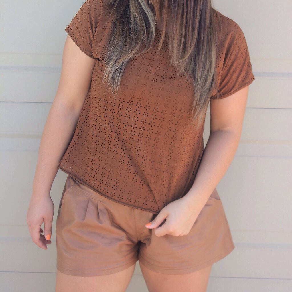 I never thought I could pull off the monochromatic look unless it involved all black or just a simple dress & shoe pair. But yesterday I accidentally threw on a pair of tan faux leather shorts & cut-out flats that were literally the exact same color. So I thought I’d give it a try or at least the closest thing to it! I chose to keep the brown element alive & add a thrifted (originally from Forever 21) boxy top that has a cut out print all over it. I liked the change of wearing all similar colors but not sure if ever do it again. There just seemed to be no wow factor to this outfit & that’s my favorite part of every outfit. These pieces just didn’t flow well together yesterday, but at least I tried!