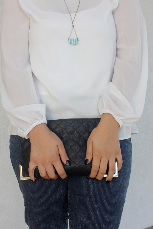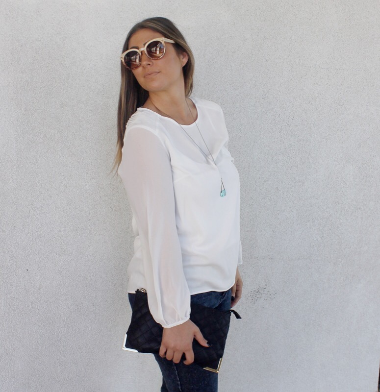 Blouse/ H&M Pants/ Forever 21 Boots/ Old Navy (similar) Clutch/ Forever 21 Sunglasses/ Free People Necklace/ Swallow’s Heart