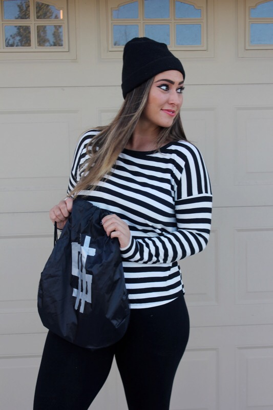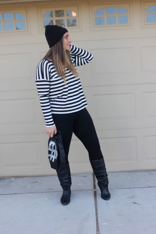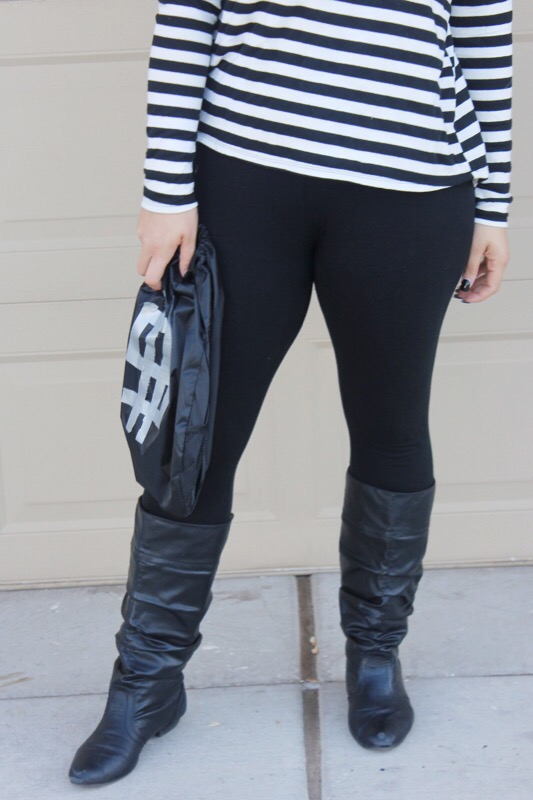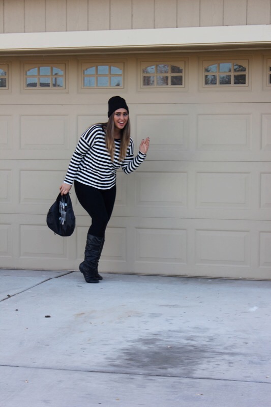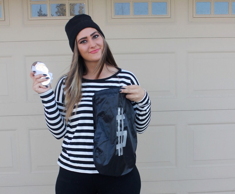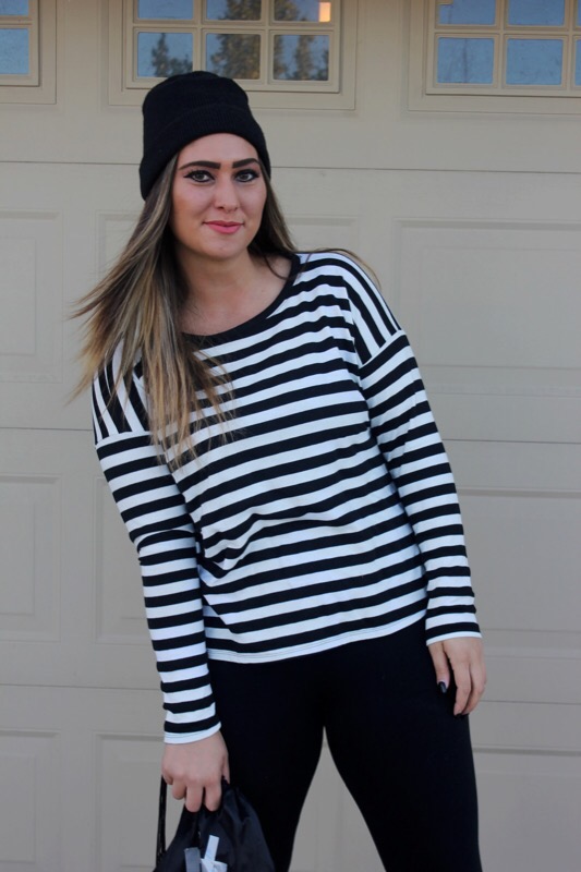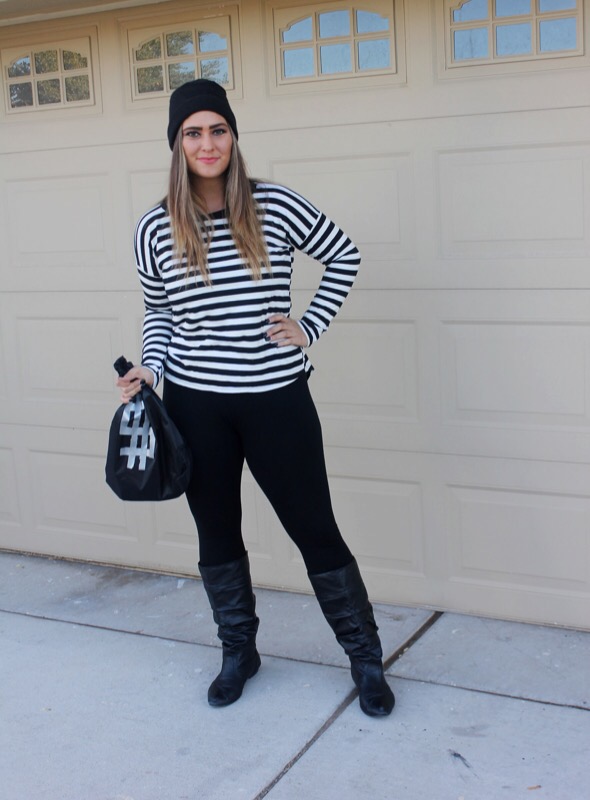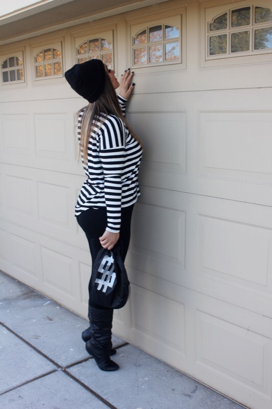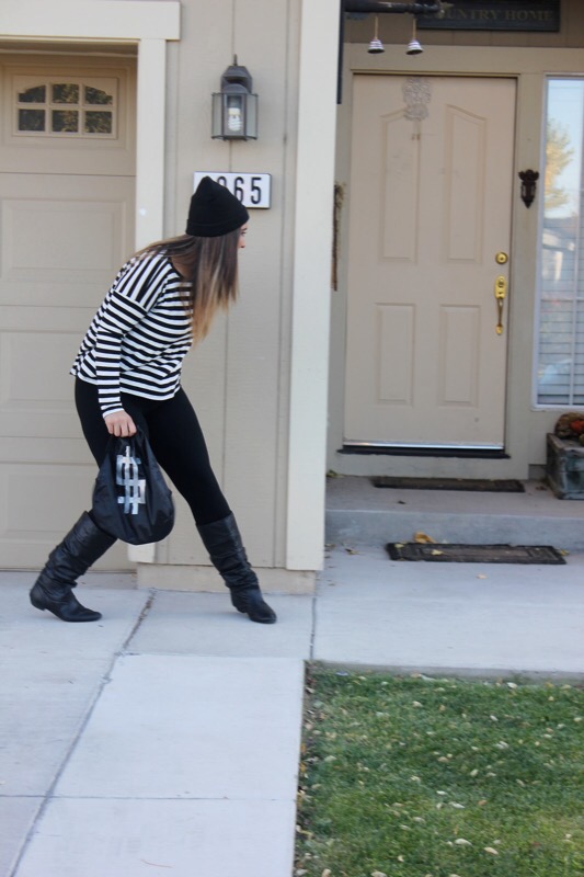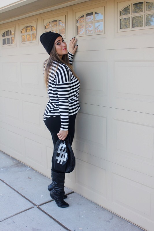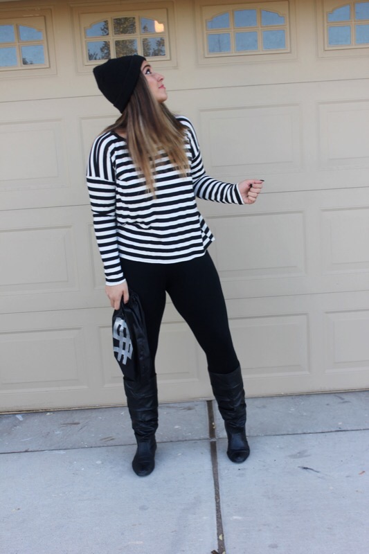 And since I have little no experience in the costume department, though I have dressed up 4 times for Halloween since I was 13, I had no idea what to dress up as when my church’s youth ministry said we were having a costume party & contest. As much as I love fashion & dressing up daily in regular clothes, I honestly really don’t like dressing out of my norm, let alone in s cheesy costume! But if you follow me over on Instagram then you saw that last week I gave everybody a clue as to what I was planning on being. Did you guess right? You’re a smart detective if you did. I’m a robber! I really didn’t know what to be, but then I remembered seeing a “robber” costume lay out on Pinterest & thought hey that’s simple & I could totally do it since I basically own it all already. So I grabbed the striped shirt, leggings, boots, & beanie, opted out of the mask, & went & bought a black drawstring bag & fake money at a dollar store & called it good. The costume only cost me $4 & that was just for the props! Cheap, simple, & cute. You literally can throw this look together in less than a day. A definitely fashionable costume that will steal the show!