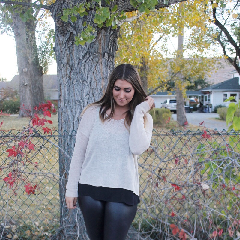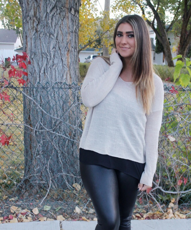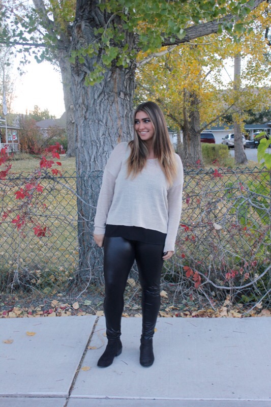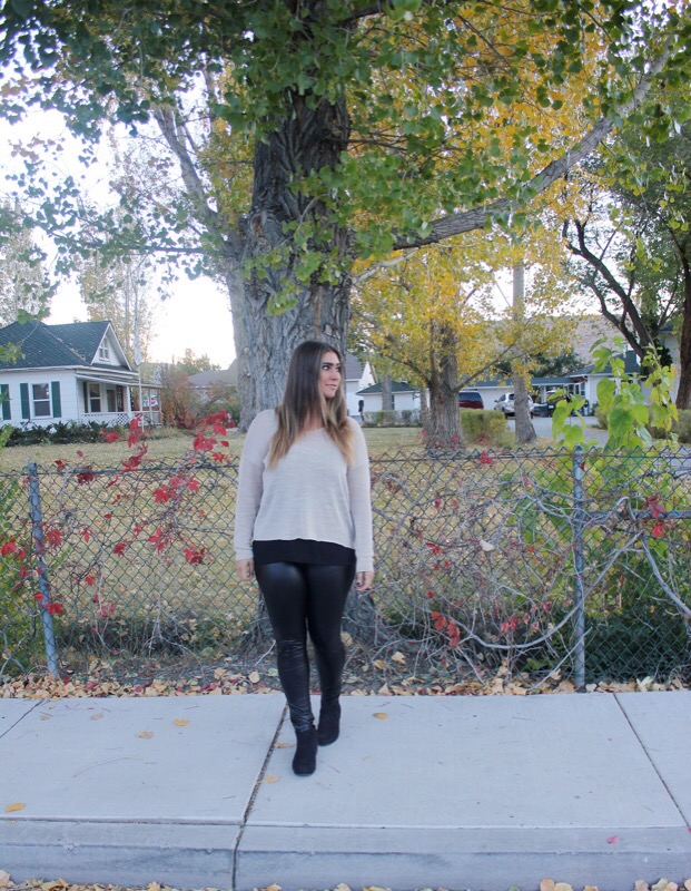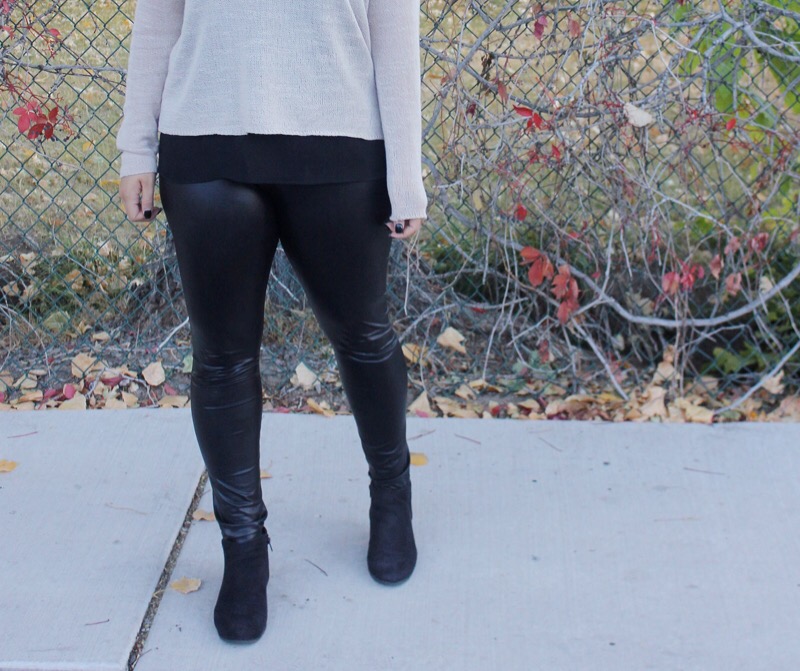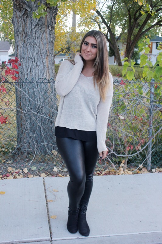 Sweater/ Forever 21 Leggings/ Burlington Coat Factory similar Blouse/ Forever 21 Booties/ Kohlms similar