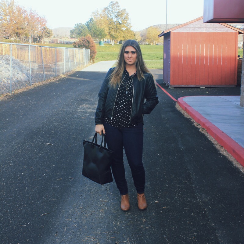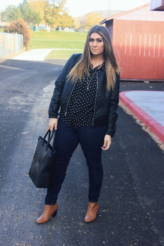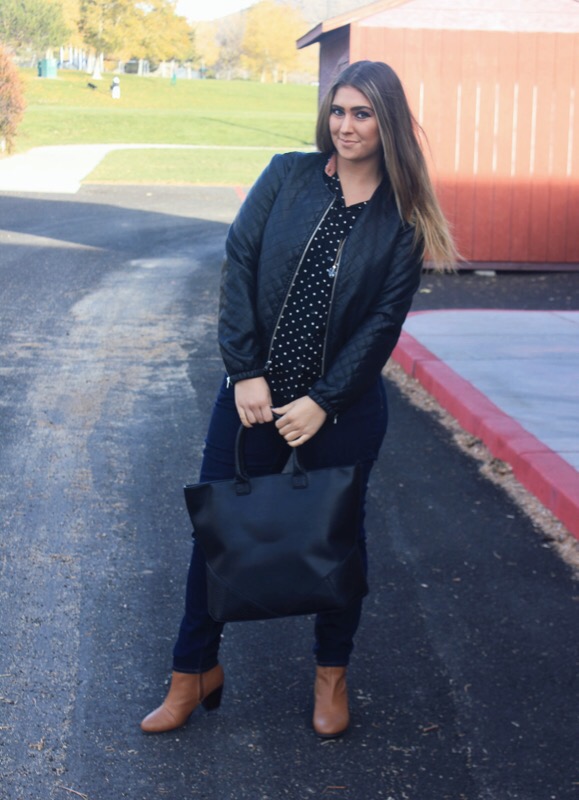 Shirt/ Forever 21 similar Jeans/ Old Navy Booties/ Old Navy Jacket/ Kohl’s Necklace/ Forever 21 similar Bag/ Forever 21