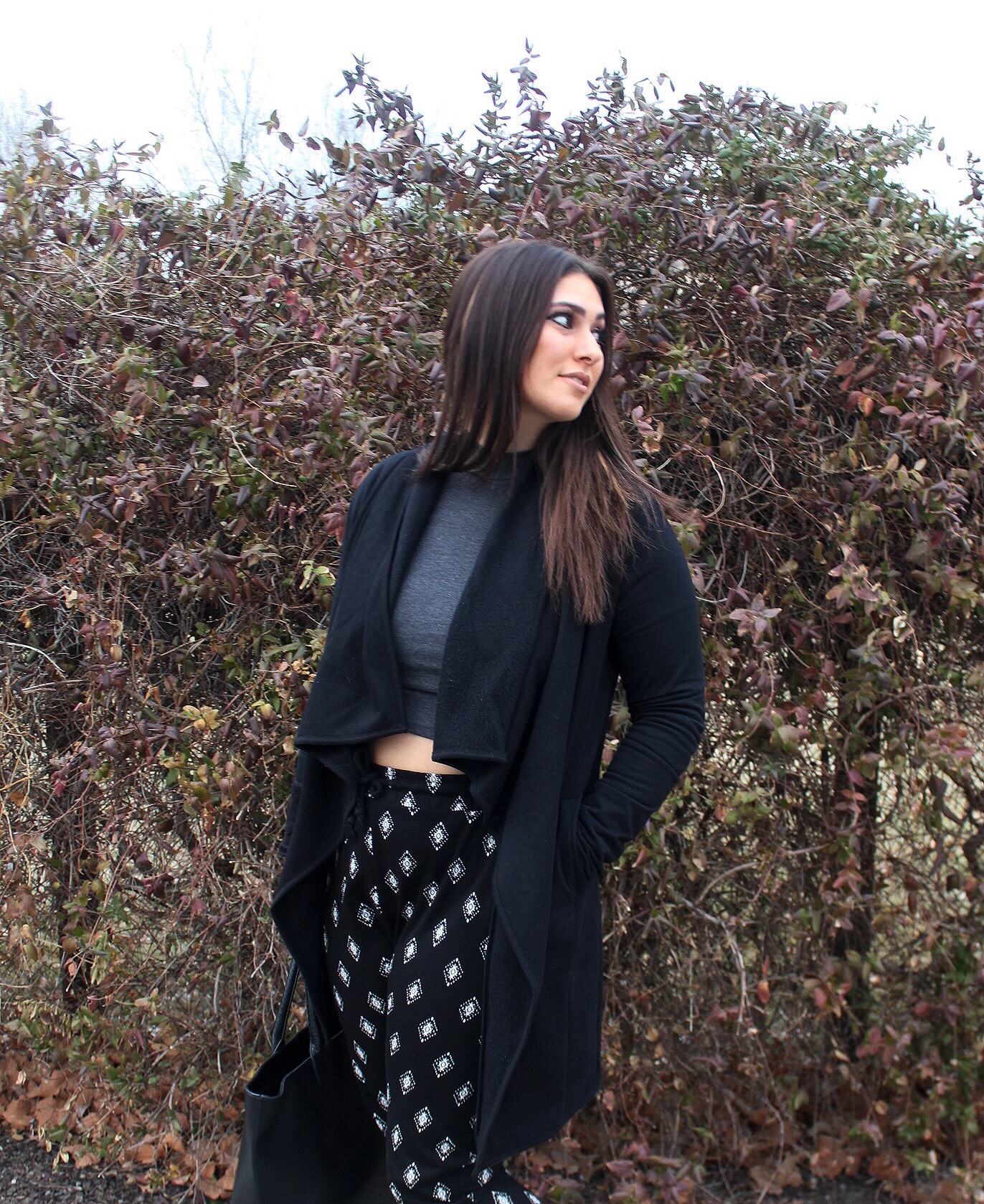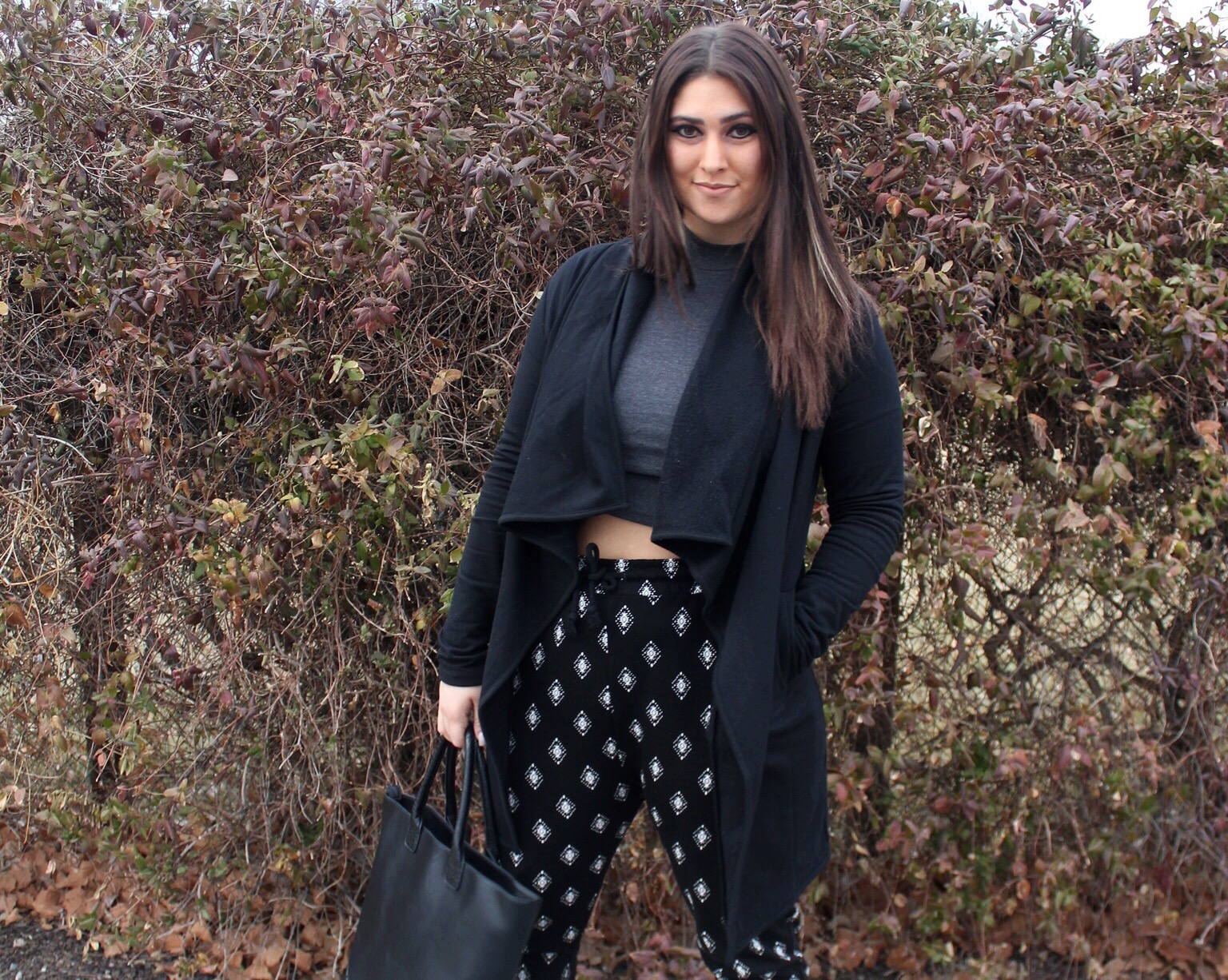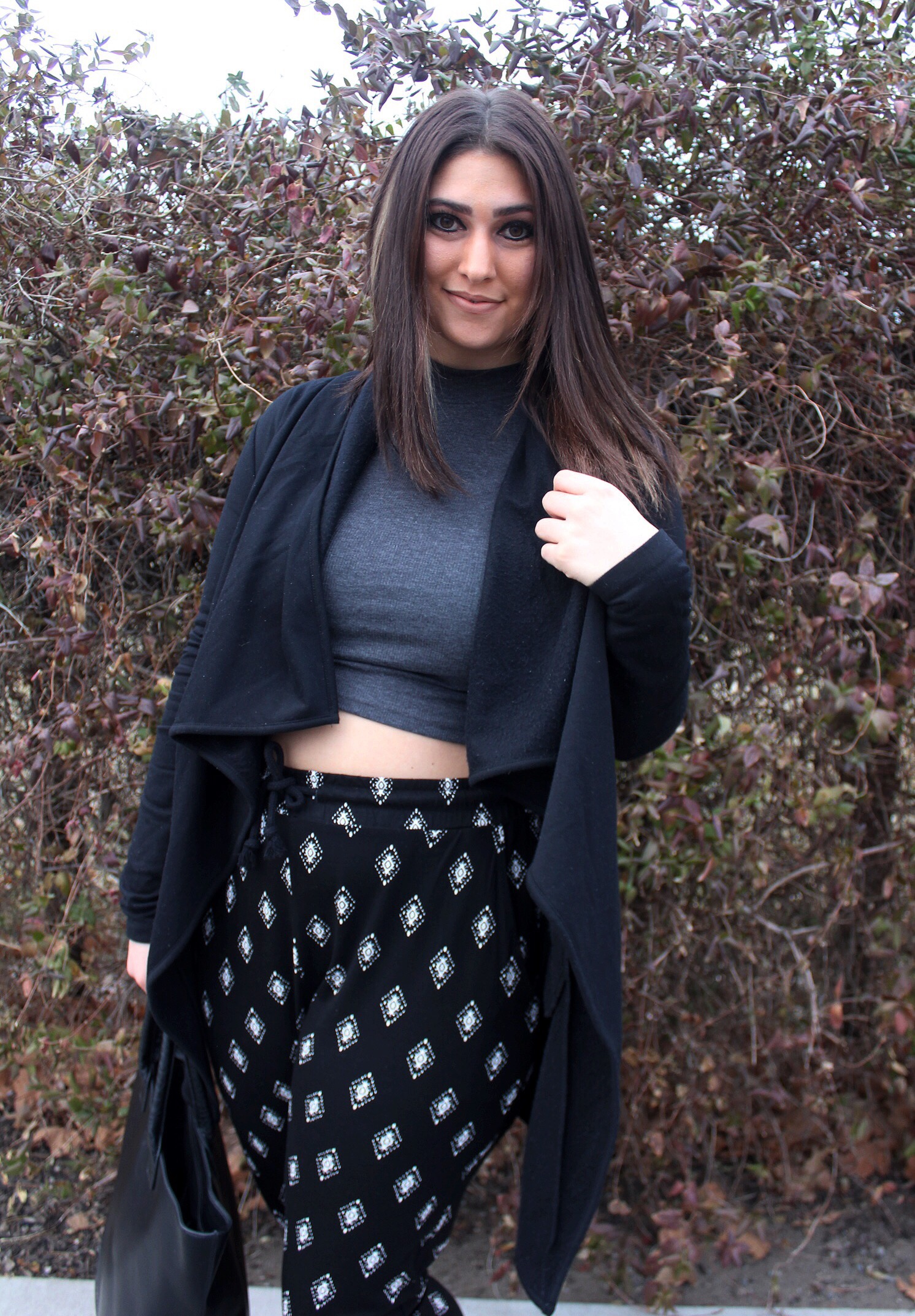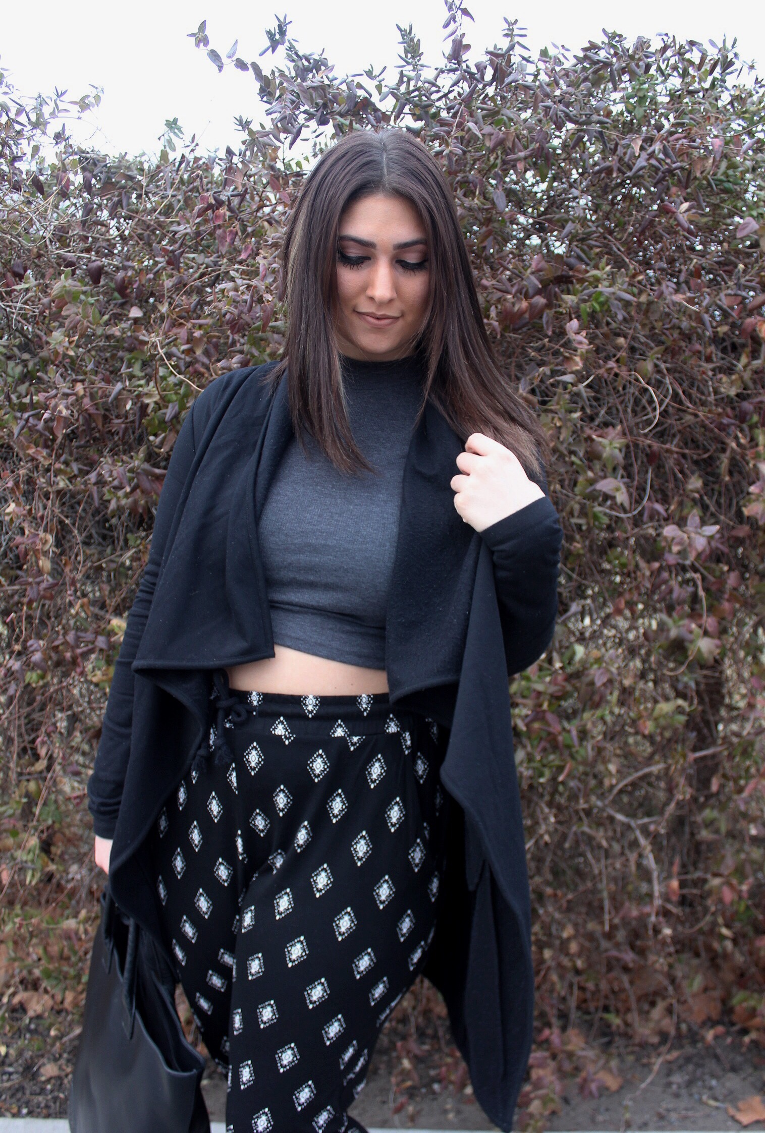 These ikat pants are exactly what you need to do just that. The pattern is bold & daring, & screams out of the norm. It also helps to elongate the body when paired with this waterfall cardigan & these brown leather booties. The three pieces together draw attention to the real selling point of the look though: the flirty, yet sophisticated cry that this turtleneck crop top seems to be saying. The pants may be what draws in your attention, but the slip of slender midriff is what keeps you around.