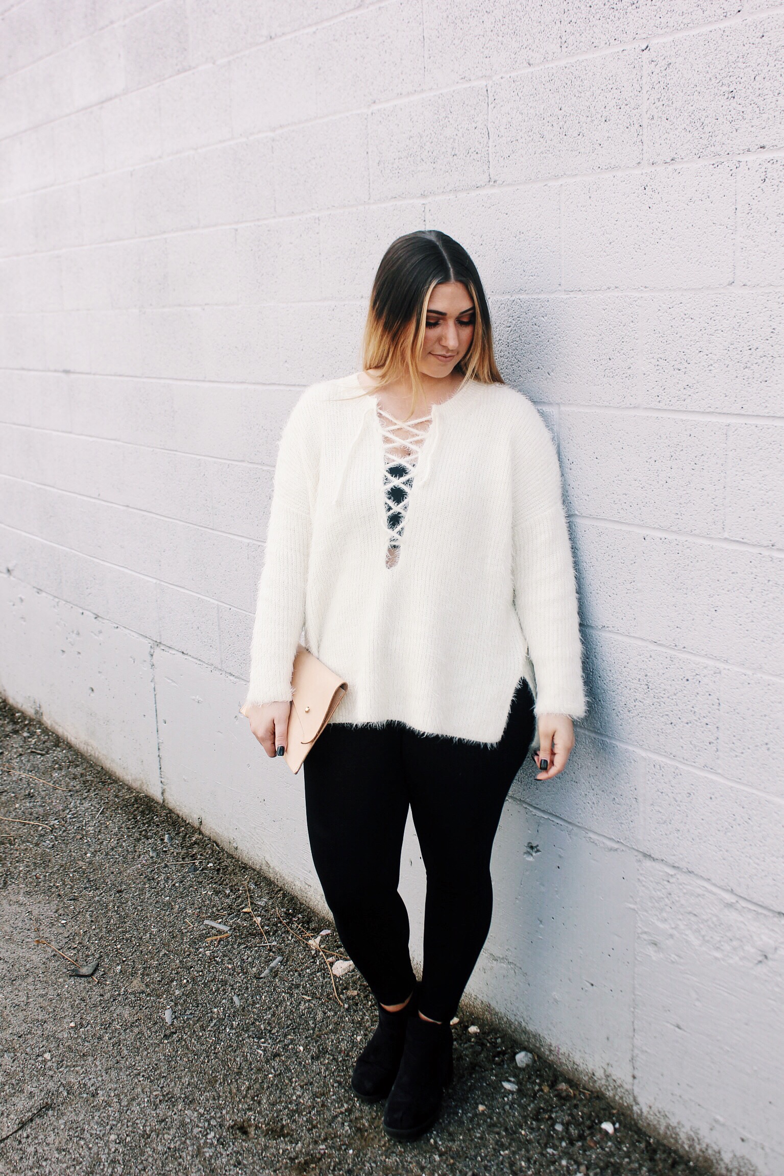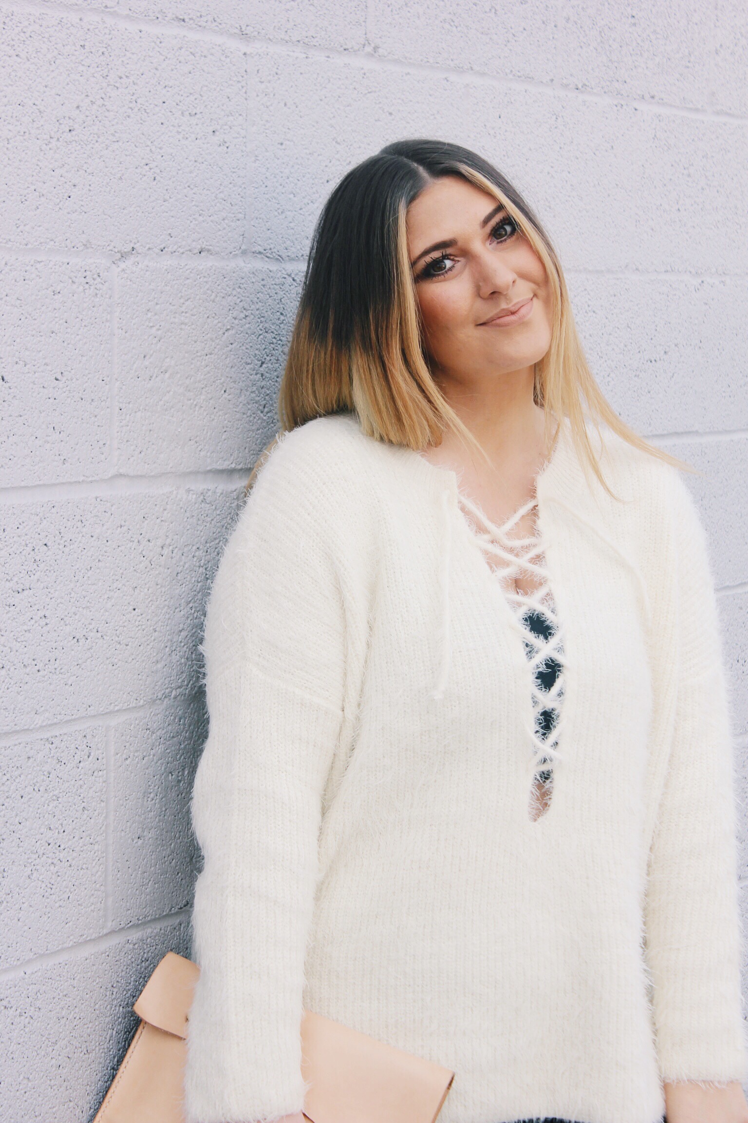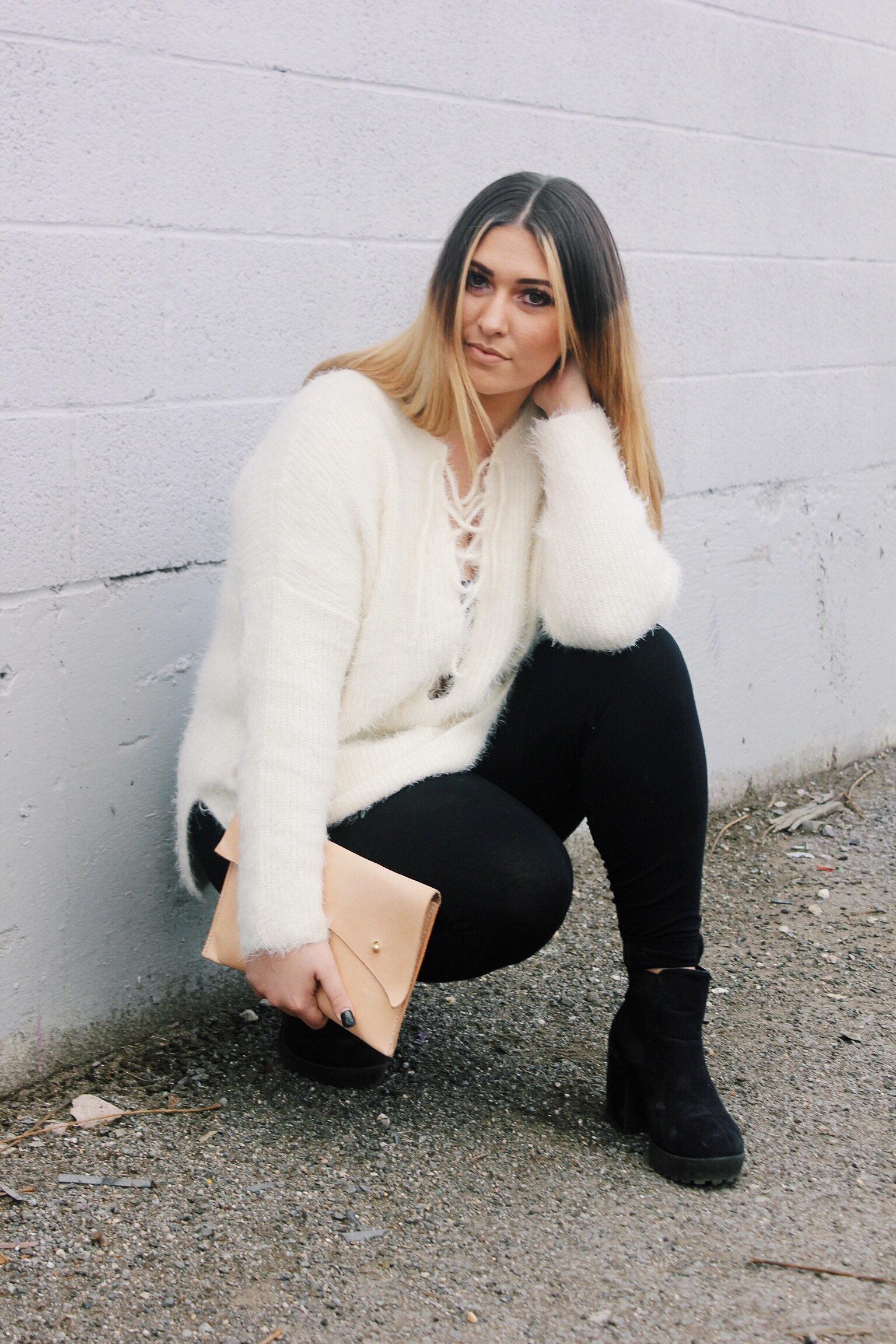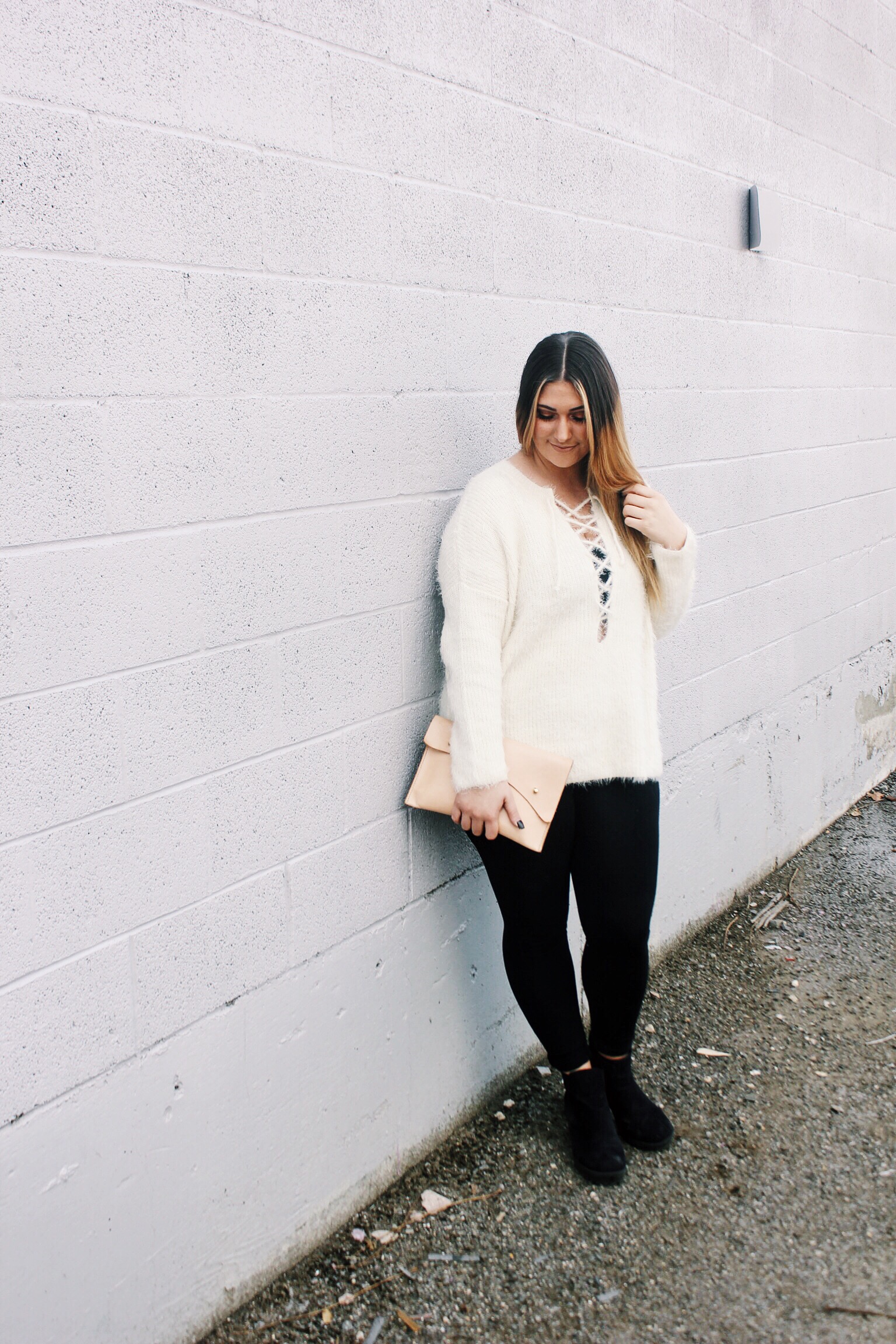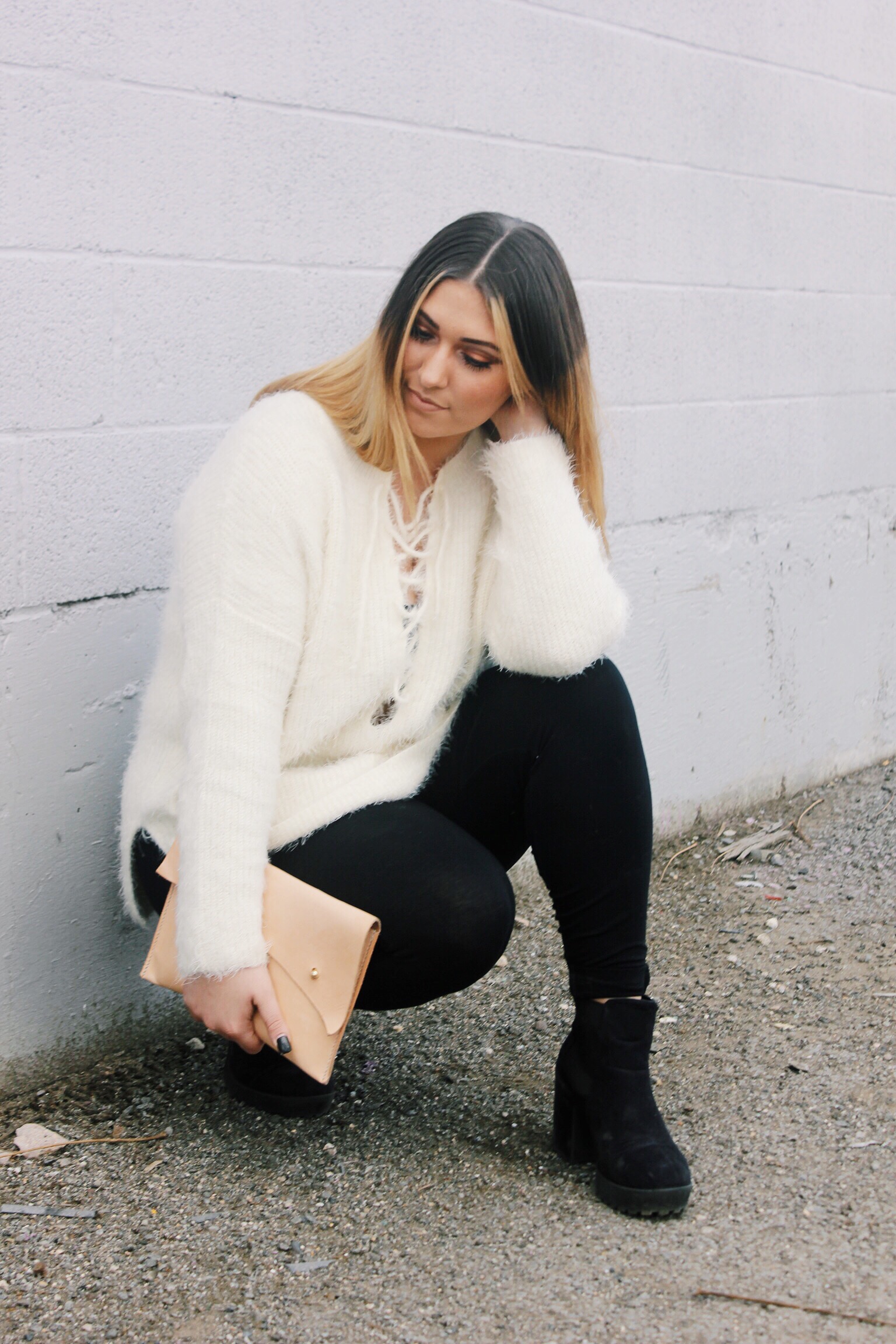 To end the year in outfits, I’m glad to show you this lace-up sweater from Top Knot Goods. I ordered it a few weeks back & instantly fell in love with it the second it arrived. The lace-up front is what immediately caught my eye, it’s all about lace-up tops this year & I totally love it! The fuzziness of this sweater makes you never want to take it off, I swear. It was a perfect top for a day of roaming my city all day & a family Christmas dinner later that night. It’s the perfect combination of casual & fancy. I chose to pair it with my Madewell leggings, Boohoo platform boots, & Walter & George clutch & loved the outcome!