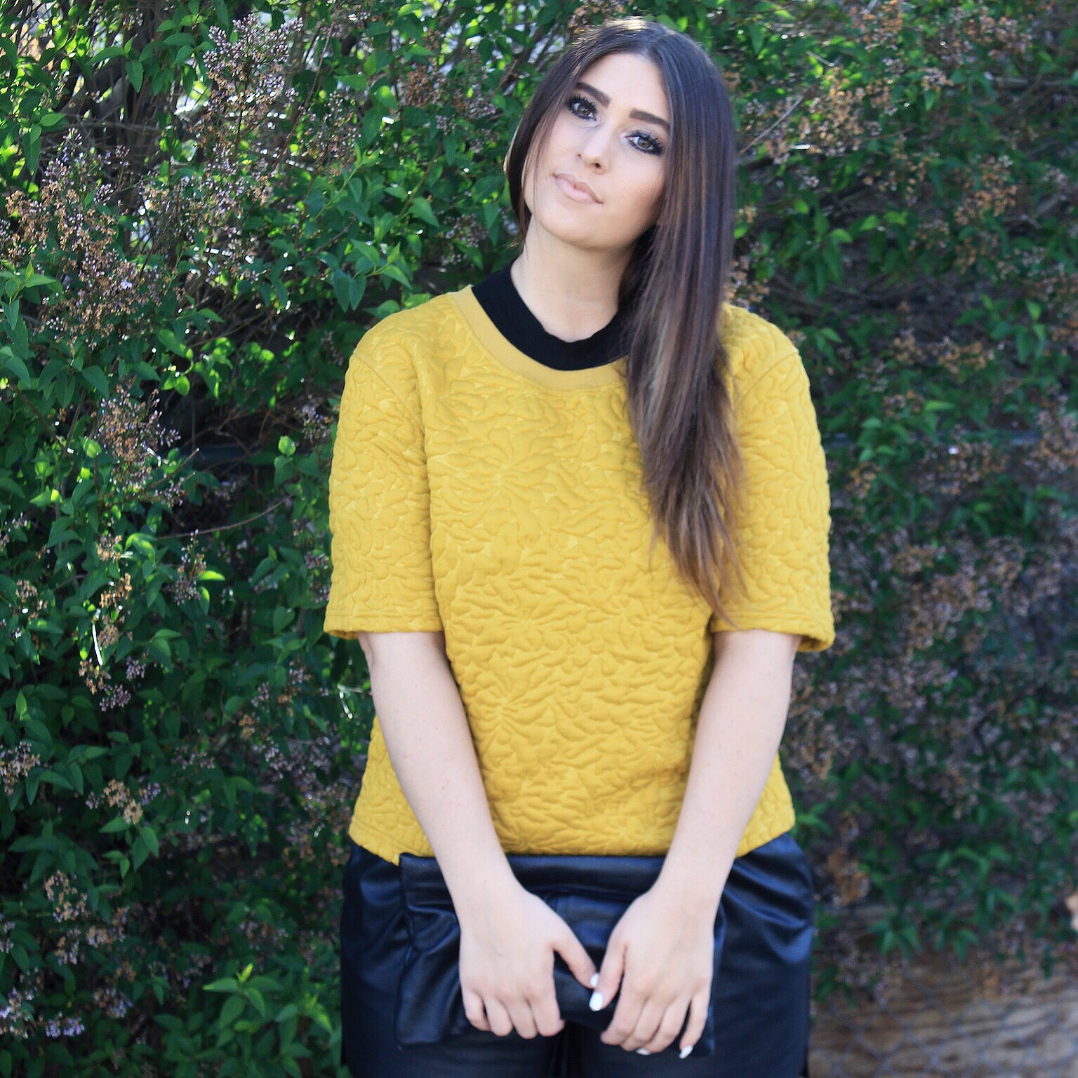 Mustard yellow is my go to color whenever I choose to wear something other than black! I loved pairing a short turtle tank under this stitched top & wearing it with leather shorts to church one Sunday. Also, look at that brown hair!