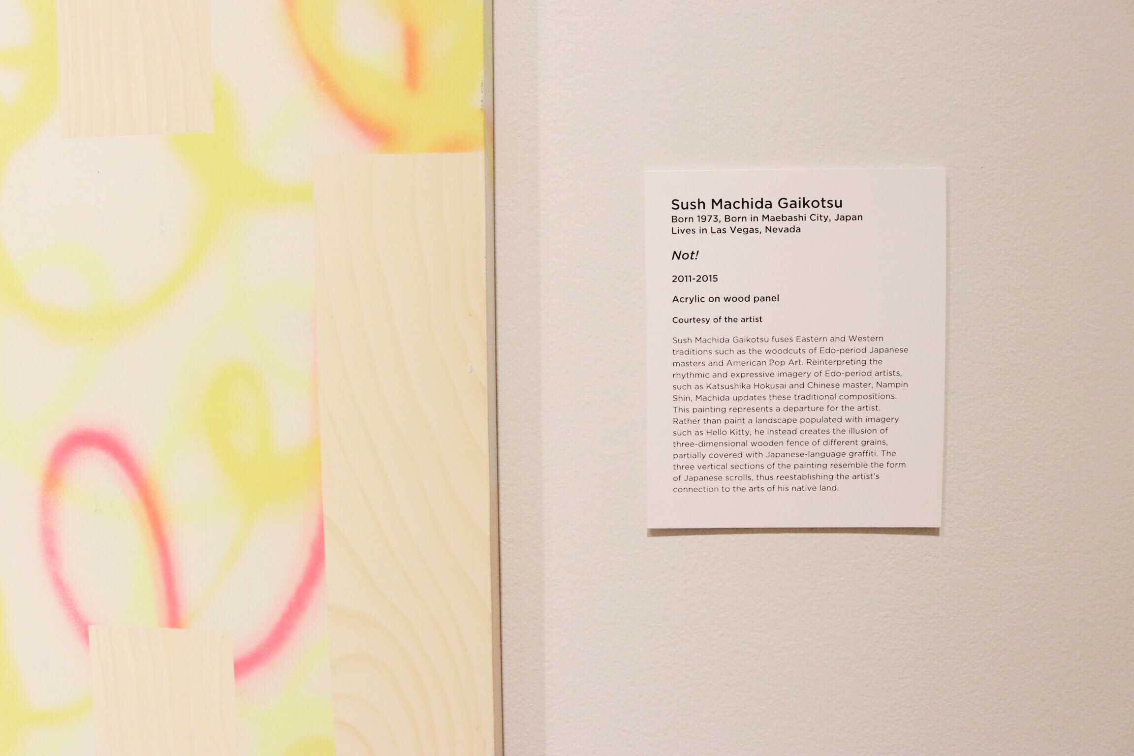 Sush Machida Gaikotsu was born in Japan & lives in Las Vegas. His art installation was inspired by the bathrooms in Japan that are filled with graffiti. He painted clips of graffiti phrases & the actual texture of wood on his piece.