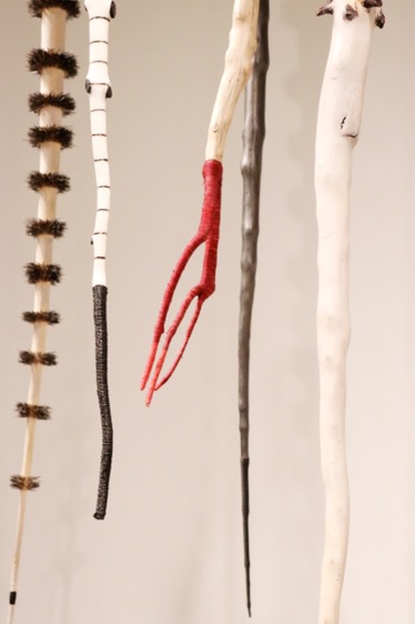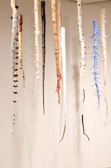 Galen Brown was a hidden treasure among the crowd that day & we got to meet him. He has three different installments in the exhibit in the back corner. Each are so unique & completely different than the other. The first, was one that immediately caught my eye that first night I walked through the exhibit. They hang from the ceiling, they’re painted with different colors & textures, & they’re beautiful. They are years of recycled Christmas trees that he has collected & this isn’t even all of them, just a selected few.