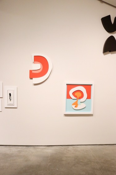 David Ryan has beautiful patches of colorful misshapen shapes of art along a corner of the all white walls in the exhibit. This is his first collection of scattered art that goes together.